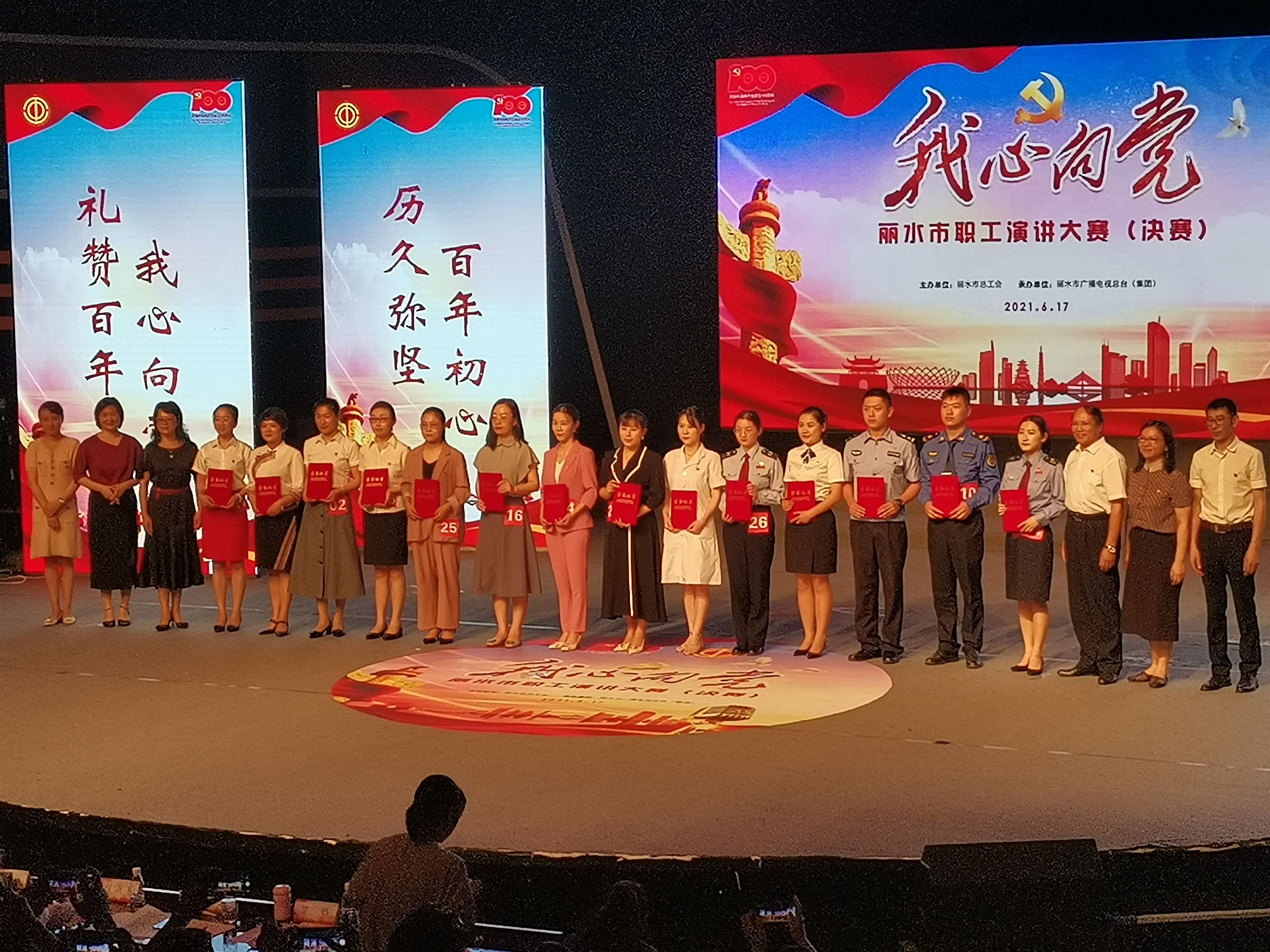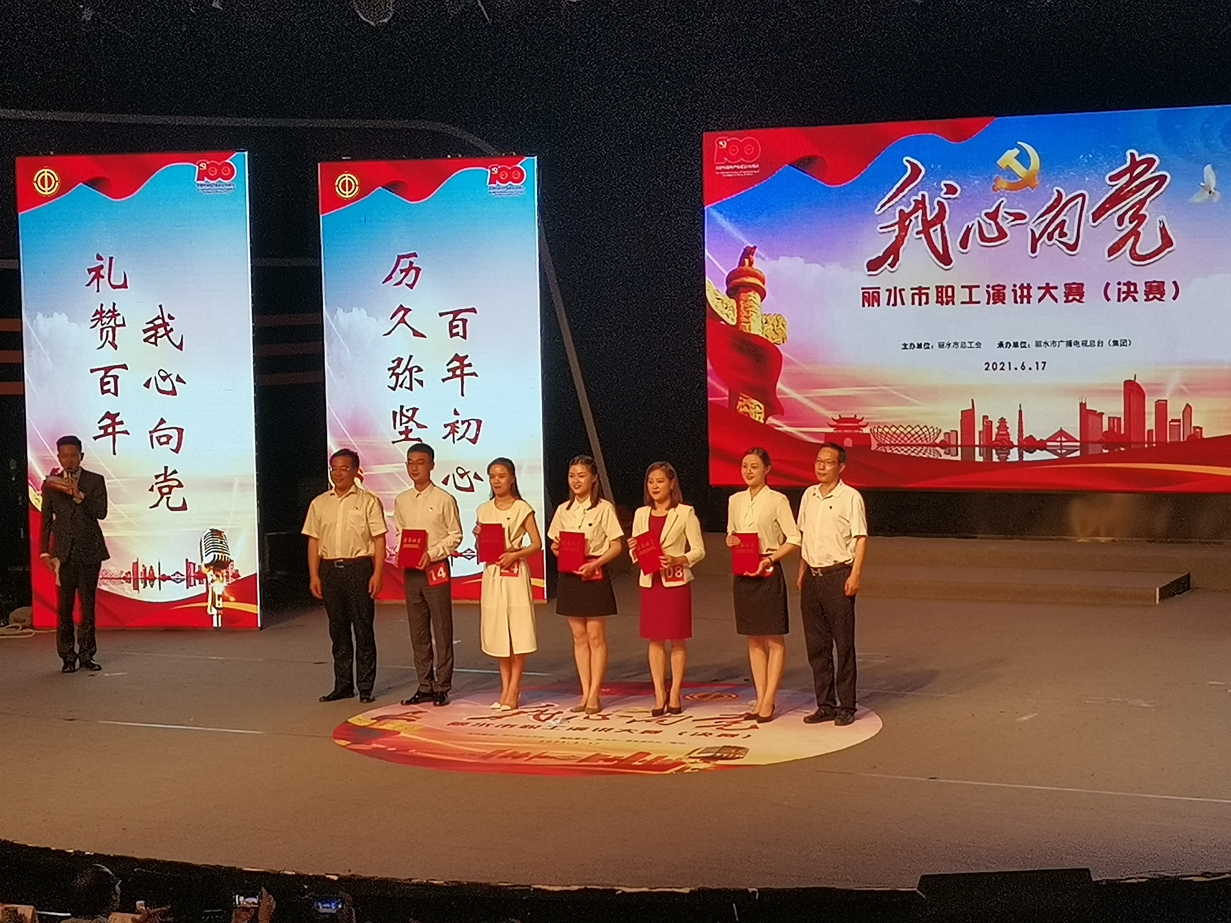 6月17日上午,由丽水市总工会主办、丽水市广播电视总台(集团)承办的“我心向党”丽水市职工演讲大赛(决赛)中,由莲都区总工会选送的选手王楚清,以总分96.32的成绩第一名力压群雄,获得一等奖。张莉莉选手获得三等奖,展现了莲都工会人的风采。