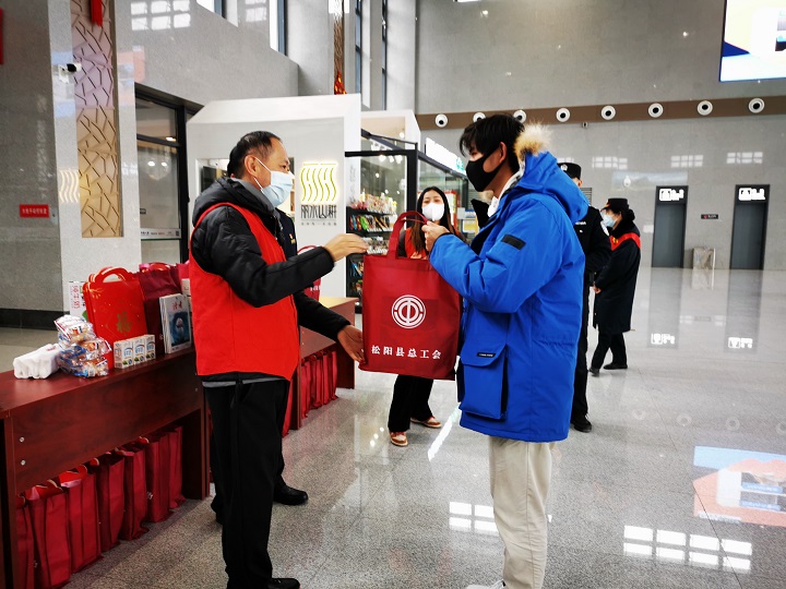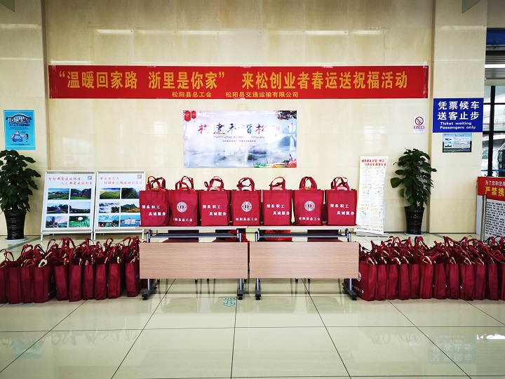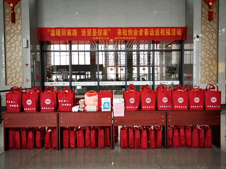 1月19日-20日,松阳县总工会联合松阳县交通运输有限公司及金华车务段松阳站,分别在县客运中心和火车站开展“温暖回家路,浙里是你家”来松创业者春运送祝福活动。为回家过年的来松创业者送上“七个一”春节大礼包,内容包括一封问候信、一份牛奶、一份面包、一份工会宣传纸巾、一份普法杂志、一份工会宣传袋、一份祝福(对联、红包、“福”字)等物品,让他们在回家途中感受到松阳工会“娘家人”的温暖。