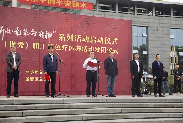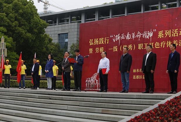 为激发全市职工高举“两山”理念发展旗帜和干事创业热情,今天上午,550名劳模和一线(优秀)职工将赴遂昌、龙泉、缙云、云和等九个革命老根据地,开启弘扬践行“浙西南革命精神”红色之旅。启动仪式由市人大常委会副主任、市总工会主席郑力平主持,市政府副市长徐光文、莲都区副区长俞丽威、市总工会班子成员等出席。