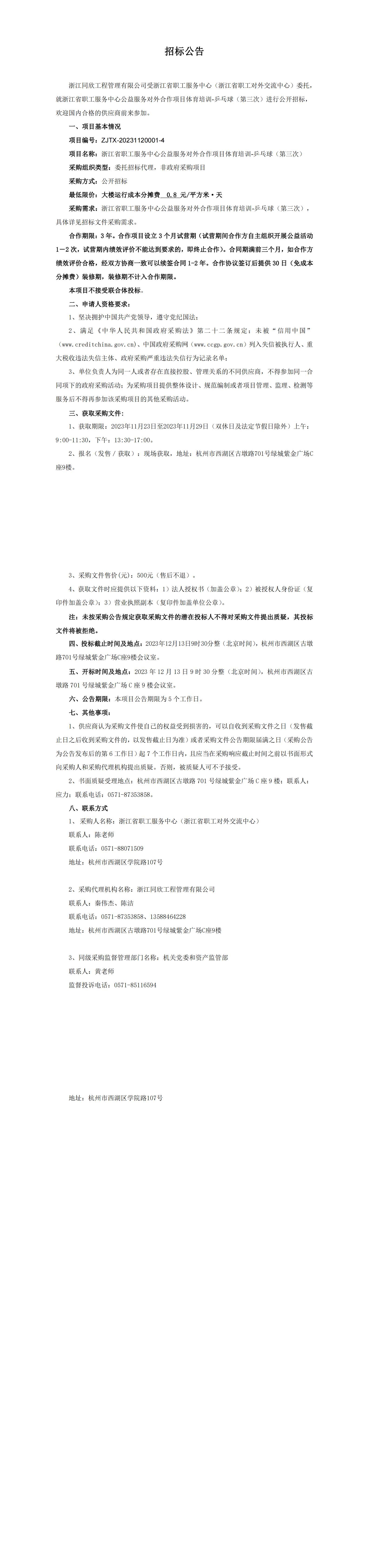 浙江省职工服务中心公益服务对外合作项目体育培训-乒乓球(第三次)招标公告