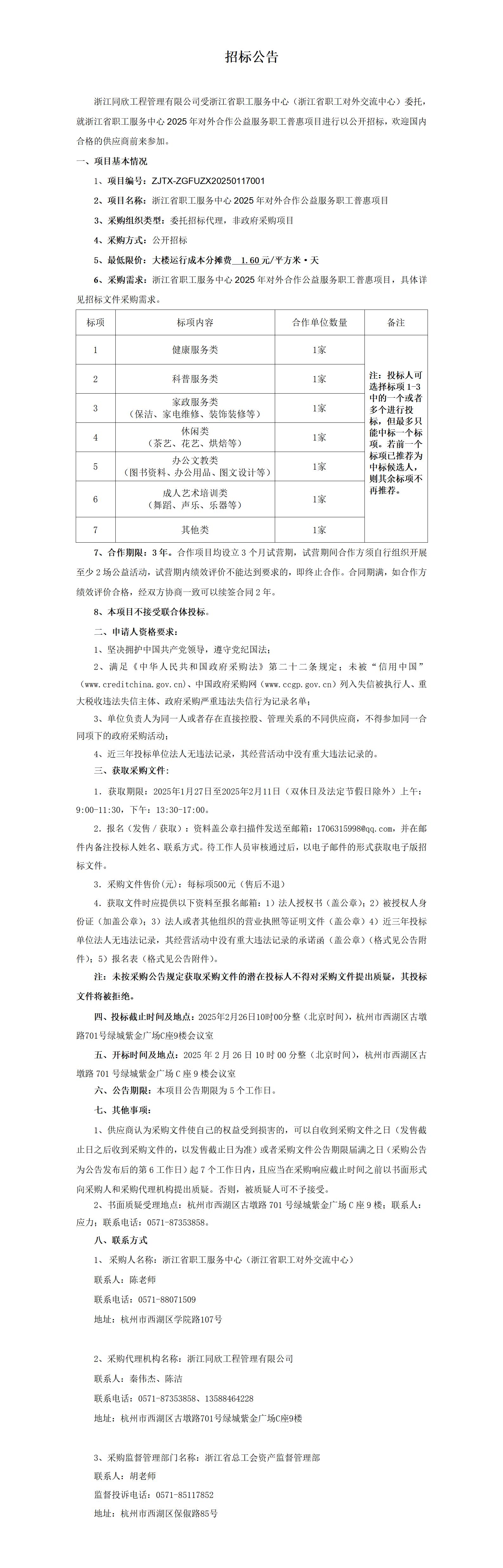 关于浙江省职工服务中心2025年对外合作公益服务职工普惠项目的招标公告