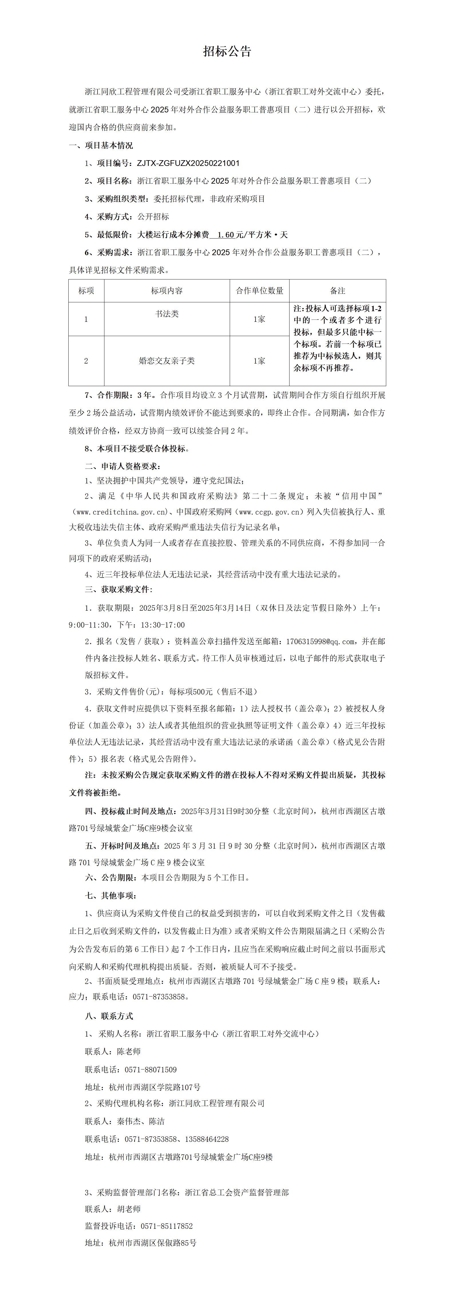 关于浙江省职工服务中心2025年对外合作公益服务职工普惠项目(二)的招标公告