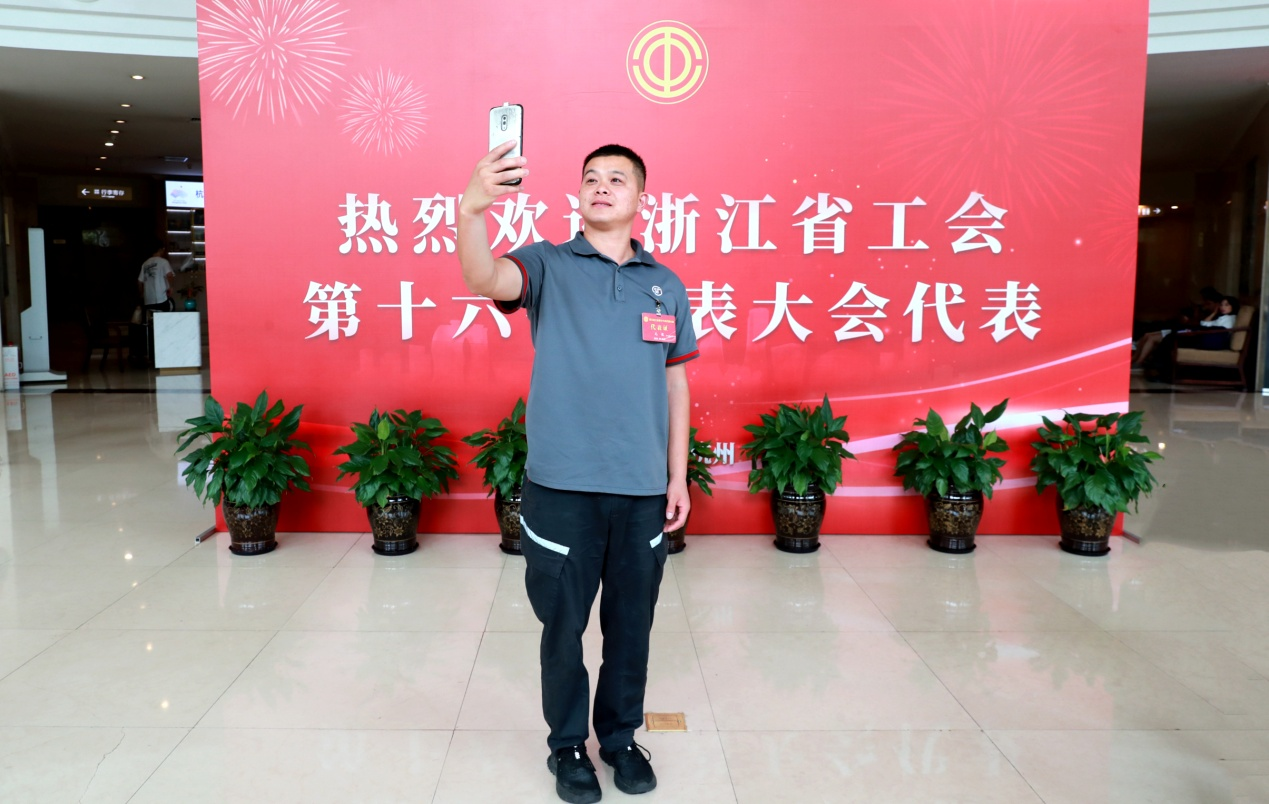 宁波顺丰速运有限公司快递员毛俊代表在驻地用手机自拍记录“工代会”时刻。