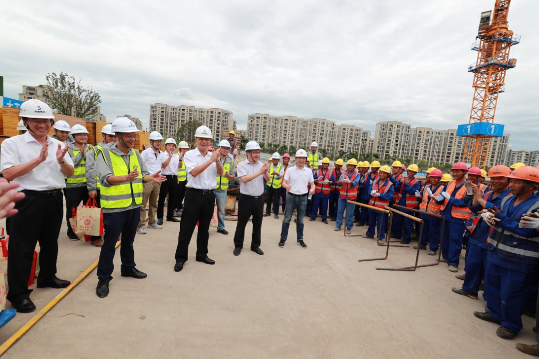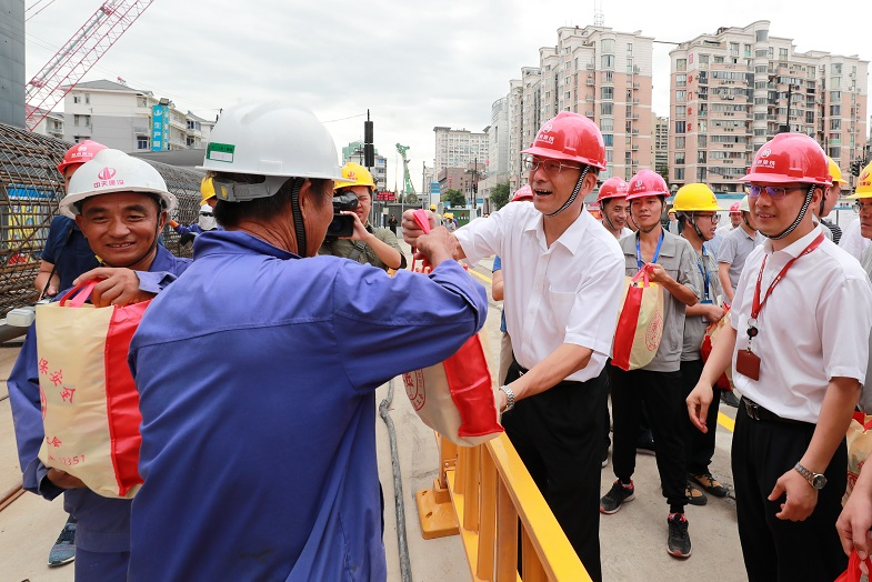 在建设现场,史济锡一行听取了建设单位工作人员的工程进展情况介绍,来到一线工人身边,一一递上防暑降温用品,向他们表示问候。