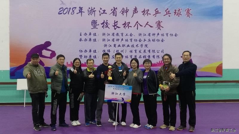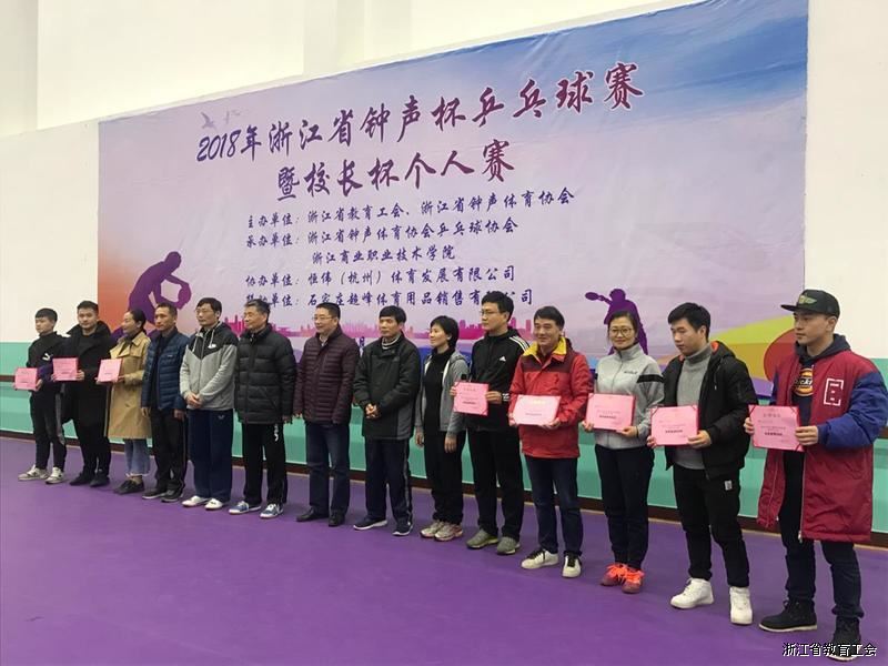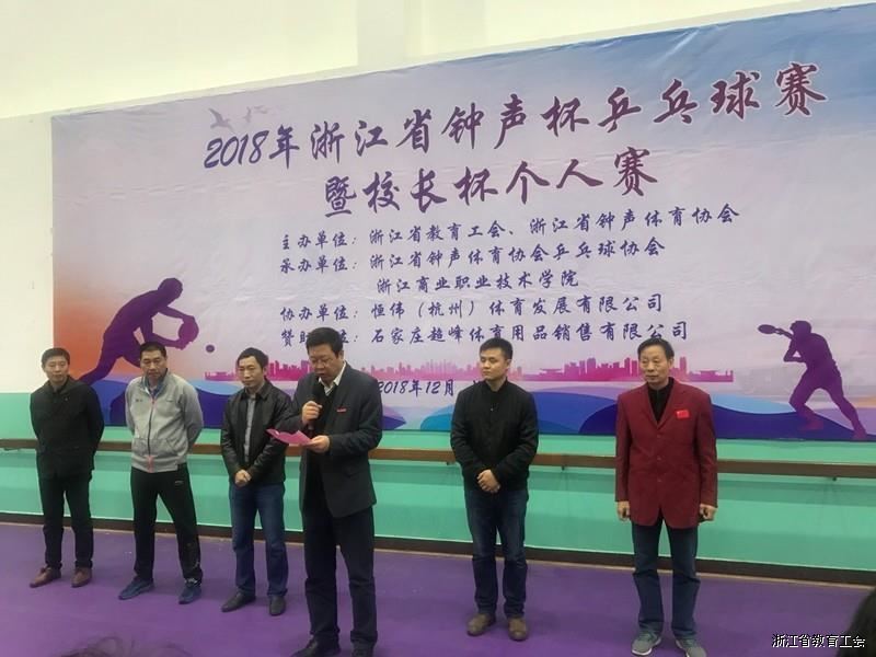 12月6日至8日,由省教育工会、省钟声体育协会主办,省钟声体育协会乒乓球协会、浙江商业职业技术学院承办,恒伟(杭州)体育发展有限公司协办的2018年浙江省“钟声杯”乒乓球赛暨校长杯个人赛,在浙江商业职业技术学院德胜校区体育馆顺利举行。省教育工会主席、省钟声体育协会主席赵祖地、省教育工会副主席竺亚汉、浙江商业职业技术学院院长张宝忠、省教育工会组织建设部部长、省钟声体育协会秘书长郑喆、省钟声体育协会乒乓球协会秘书长恽冰、浙江外国语学院党委书记宣勇、浙江音乐学院党委书记胡建新、湖州师范学院党委副书记黄建平、省钟声体协副主席陈荣霞等分别出席开幕式、闭幕式。