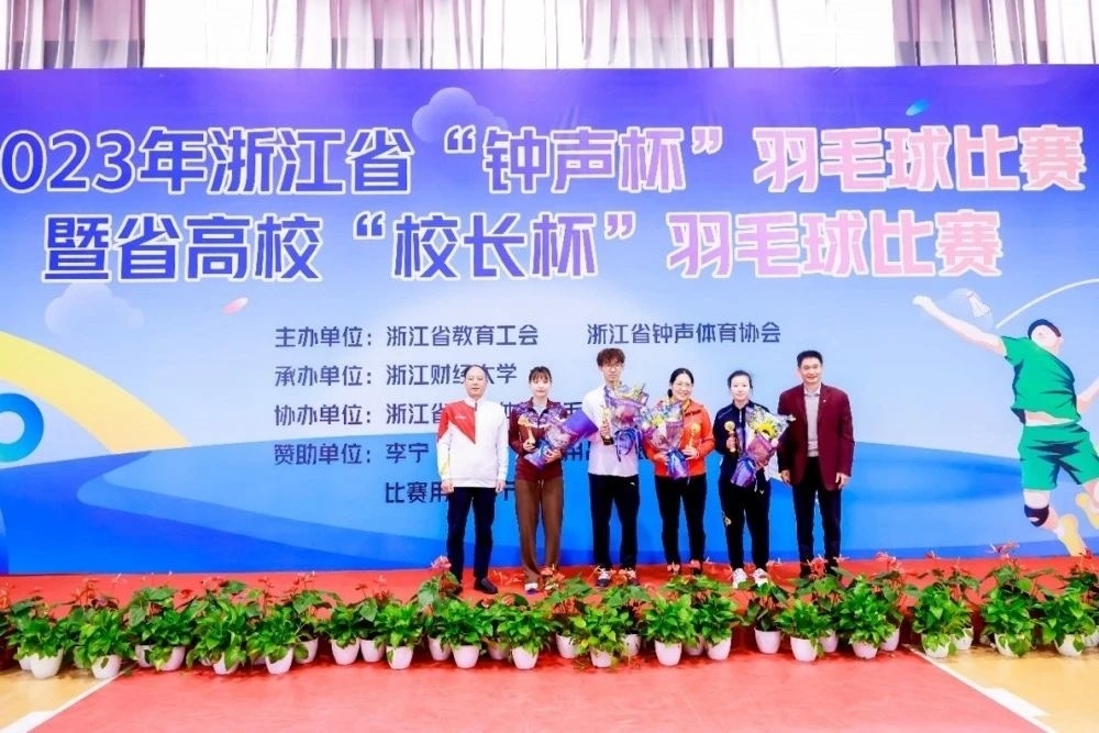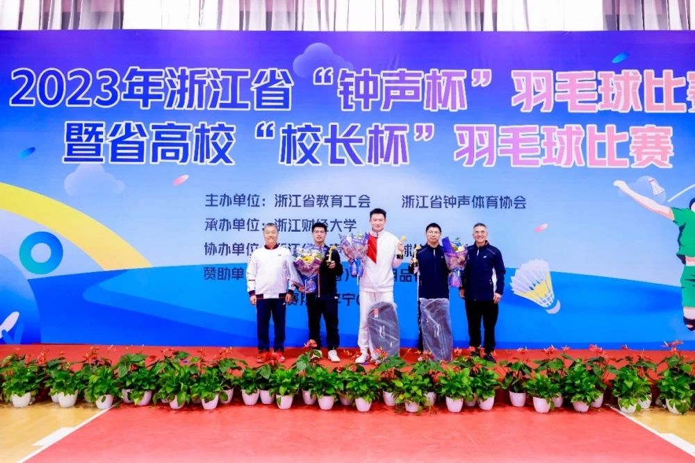 浙江财经大学党委副书记徐晓东和有关高校领导朱世强、王兴杰、吕一军、洪岗为“钟声杯”混合团体获奖单位和“校长杯”双打获奖个人颁奖。