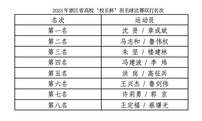 温州医科大学沈贤、章成斌一举夺魁,获得“校长杯”双打第一名,湖州学院马志和、鲁伟权及浙江师范大学朱坚、湖州师范学院楼建林两组队员分别获得“校长杯”双打第二名、第三名。