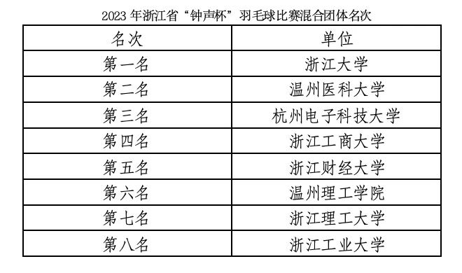经过激烈比拼,浙江大学代表队摘得混合团体赛第一名,温州医科大学和杭州电子科技大学分获混合团体赛第二名、第三名。浙江工商大学、浙江财经大学、温州理工学院、浙江理工大学、浙江工业大学分获混合团体赛第四至八名。