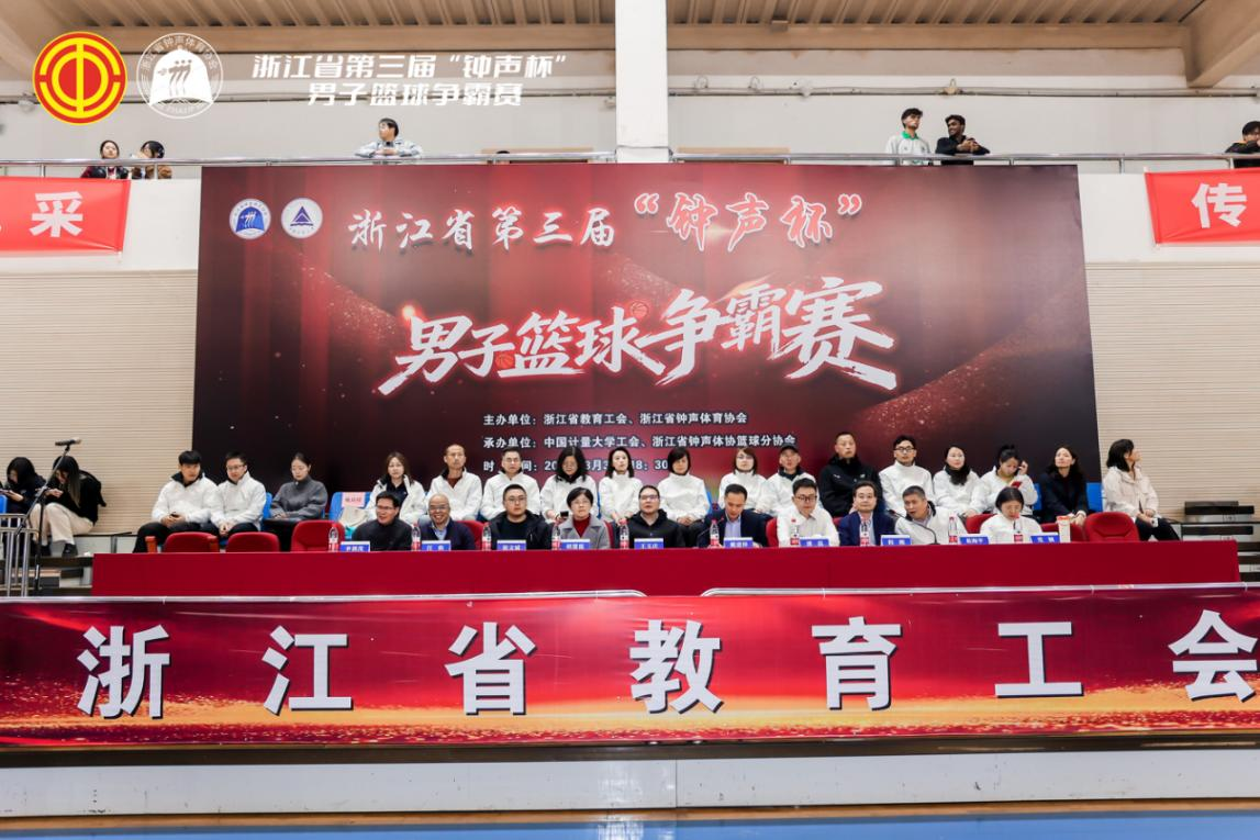 3月31日晚,由浙江省教育工会、浙江省钟声体育协会主办,中国计量大学工会、浙江省钟声体协篮球分协会承办的第三届浙江省“钟声杯”男子篮球争霸赛在中国计量大学天健体育馆火热开赛。浙江省教育工会主席、省钟声体育协会主席王玉庆,中国计量大学党委副书记、副校长(主持行政日常工作)戴道锌,省教育工会相关领导、省钟声体协负责人,以及参赛高校工会负责任人等40余人出席开赛活动,活动由中国计量大学党委副书记、工会主席程刚主持。