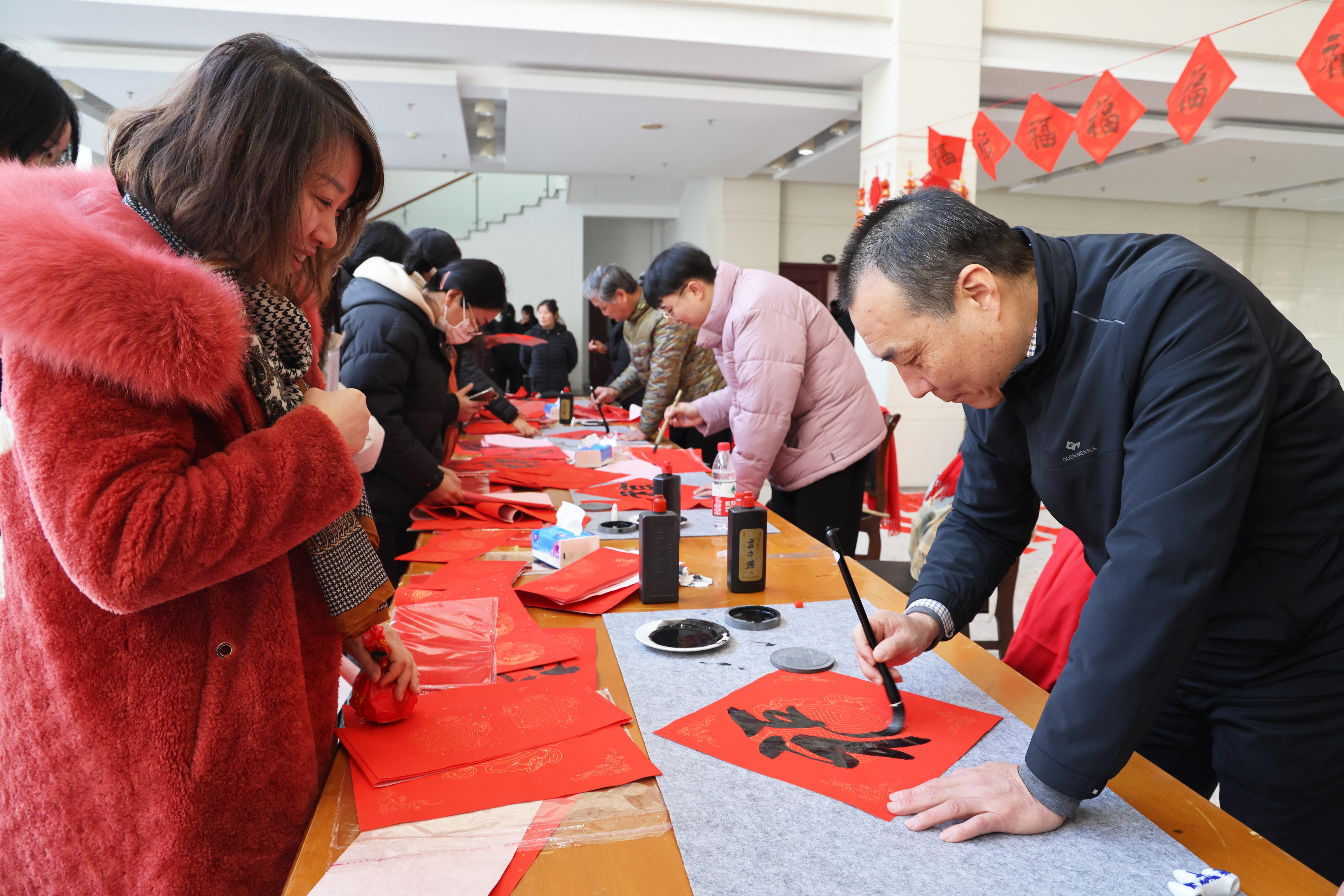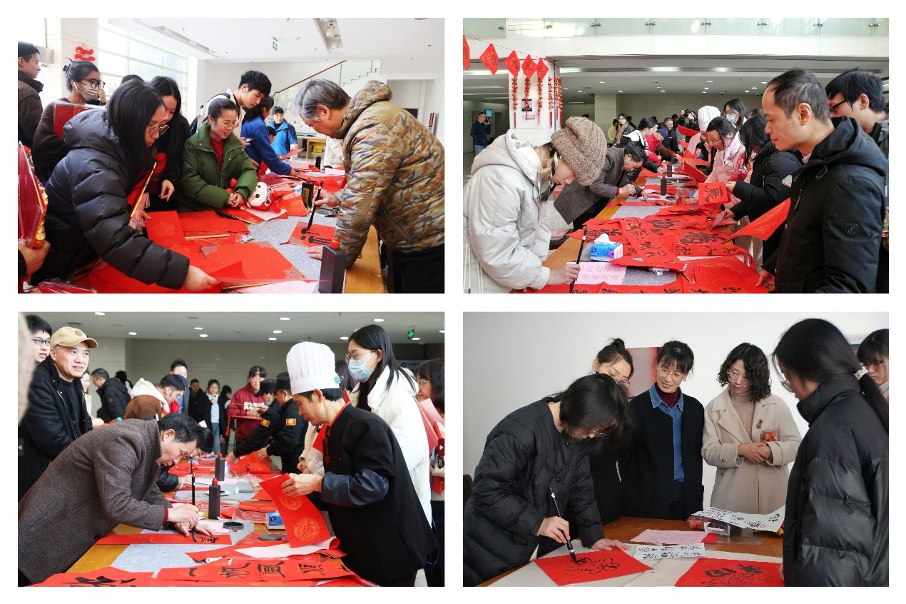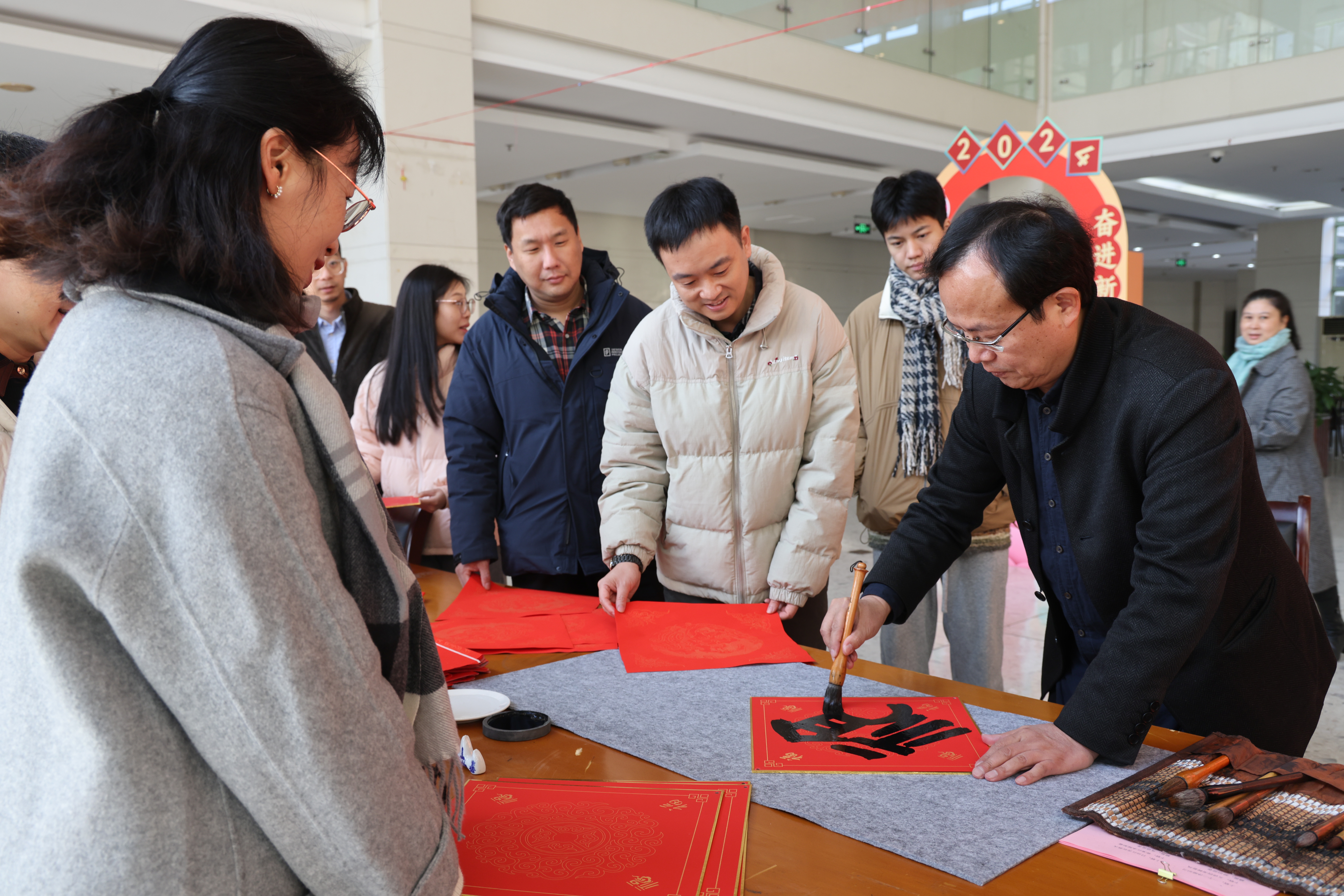 活动现场,人头攒动,热闹非凡,前来参加活动的师生员工络绎不绝。学校领导与10余位离退休老同志、师生书法爱好者,现场挥毫泼墨,潜心创作。一副副喜庆吉祥、满载祝福的对联随笔尖流动而出,一张张红红火火的“福”字在手上传递,师生们边欣赏、边讨论,围在一旁领略书法魅力,整个活动洋溢着节日的喜庆气氛,荡漾着墨汁的扑鼻芳香。活动累计送出春联2500余副,“福”字3500余个,以及中国结、红辣椒、红灯笼、红鞭炮、福袋等各类年俗节庆用品。