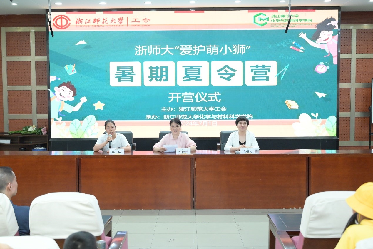 2024年7月1日上午,由校工会主办,化学与材料科学学院承办,体育学院、人文学院、外语学院、艺术学院、物电学院、生科院协办的“爱护萌小狮”教职工子女暑期夏令营在孩子们的期待和笑语中拉开帷幕。化材学院党委书记谢枝文、校工会副主席毛晓青、各二级工会主席出席开营仪式,共同见证这一欢乐时刻。开营仪式由化材学院工会副主席吴瑛主持.