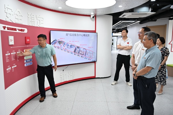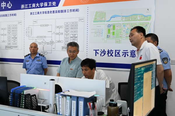 王永贵一行来到学校保卫处监控中心、各岗亭、“商³”综合治理服务中心(浙江工商大学校警驿站),详细了解值守人员工作情况。在监控中心,王永贵检查了校园重点位置的暑期安防措施,并询问了教工路校区的安全管理情况;在校警驿站,他与驻点民警、值班人员进行了交流,叮嘱大家在维护校园秩序的同时,注意劳逸结合,以最佳状态为师生筑起坚实的安全屏障,保障校园安全和稳定。