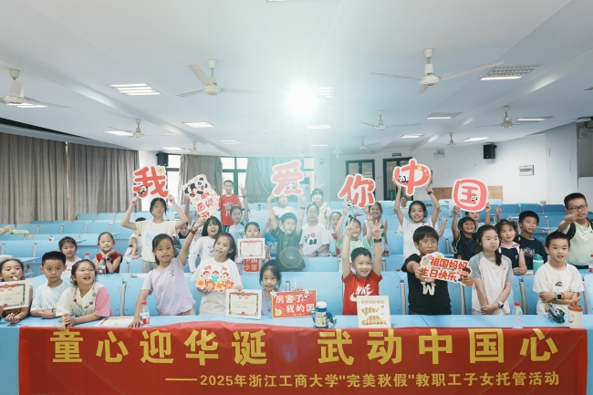 金秋九月,丹桂飘香。为庆祝新中国成立 76 周年、纪念中国人民抗日战争暨世界反法西斯战争胜利 80 周年,厚植商大宝贝的家国情怀,9 月 29 日,浙江工商大学工会、妇联联合外语学院工会,以 “童心迎华诞 武动中国心” 为主题,开展了 2025 年完美秋假教职工子女托管活动,近百位萌娃在校园里沉浸式体验了爱国教育、非遗传承与武术魅力,收获满满。