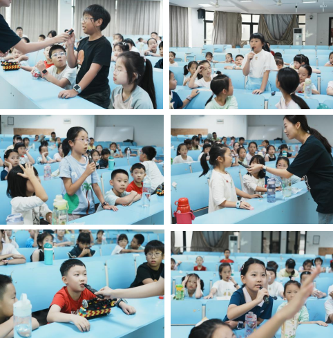 活动伊始,浙江工商大学外语学院阶梯教室内暖意融融,“传承红色基因 厚植爱国情怀” 爱国故事小课堂率先开启。志愿者姐姐以生动鲜活的语言,为孩子们讲述国旗、国徽、国歌的由来与象征意义 —— 从五星红旗的设计故事,到国徽中齿轮与谷穗的寓意,再到国歌《义勇军进行曲》背后的抗战精神,一个个红色故事像小种子,悄悄落进孩子们的心里。课堂上,孩子们坐姿端正、眼神专注,亮晶晶的眼眸里满是好奇与崇敬,时而举手提问 “国旗上的五颗星代表什么呀?”,时而跟着姐姐哼唱国歌,稚嫩的声音里满是对祖国的热爱,宛如一颗颗闪闪的红星,点亮了整个教室。