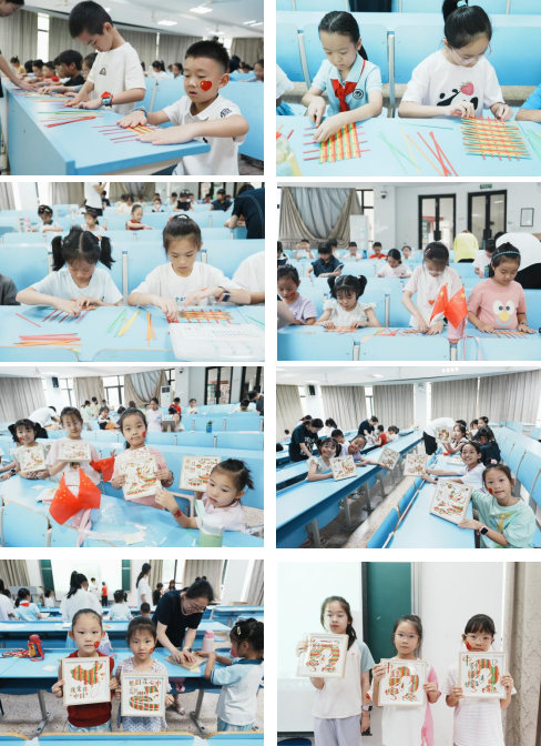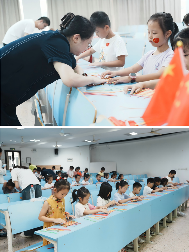 “大家看,这个竹编摆台可以拼出‘中秋快乐’的字样,也能组合成小国旗的图案哦!” 在 “童心守非遗 小手传匠心” 主题环节,浙江工商大学教职工手工协会的叶老师手持竹编材料,耐心讲解制作技巧。桌面上,彩色竹条、固定底座、装饰配件整齐摆放,孩子们小心翼翼地拿起竹条,按照叶老师的指导对折、穿插、固定,指尖翻飞间,原本零散的材料渐渐有了形状。有的孩子专注拼搭 “五角星”,有的孩子认真组合 “月亮与玉兔”,偶尔遇到困难时,便主动向老师或身边小伙伴求助,课堂里满是 “沙沙” 的竹编声与孩子们的笑声。完成作品后,孩子们高高举起自己的竹编作品争相向老师展示,脸上都洋溢着自信又自豪的笑容。