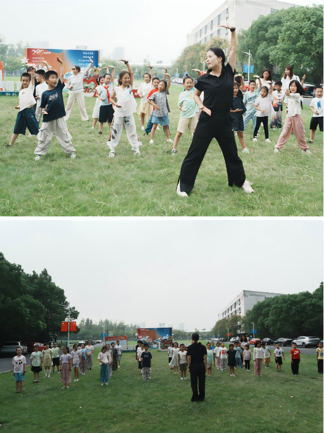 午后的阳光洒满浙江工商大学的大草坪,“跟全国武术冠军学功夫” 环节将活动气氛推向高潮。本次课堂由浙江工商大学体工部吴雪霜老师主讲。作为武术国家级裁判员,她曾多次斩获全国、浙江省健身气功比赛冠军。伴随着激昂的背景音乐,吴老师率先展示了一套行云流水的武术动作,出拳有力、踢腿沉稳,引得孩子们崇拜不已,一个个踮起脚尖、眼中满是向往。