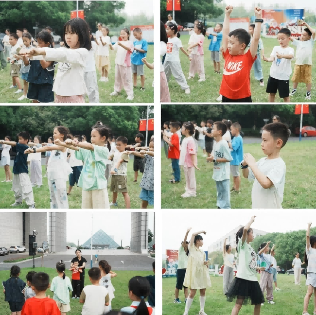 “小朋友们,先跟我学‘抱拳礼’,这是武术里的礼仪,代表尊重哦!” 吴老师手把手教学,从基础的手型(拳、掌、勾)、步型(弓步、马步),到简单的掌法组合,耐心纠正每一个孩子的姿势。孩子们挺直腰背、眼神坚定,跟着老师一招一式认真练习,原本活泼好动的小家伙们,此刻都化身成 “能文能武的功夫娃娃”。当全体孩子整齐划一地打出一套动作时,“雄赳赳、气昂昂” 的气势感染了在场所有人,草坪上满是孩子们的呐喊声与欢笑声。