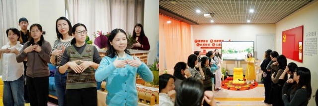 室内,全体教师在主持人引导下共舞手语舞《让爱传出去》。温柔的旋律在空间中荡起层层涟漪,跨越年龄与学科的手语共舞,为整场活动奠定了纯粹温暖的基调。一位参与教师动情道:“当指尖触碰的瞬间,仿佛触摸到了彼此内心的温度。”