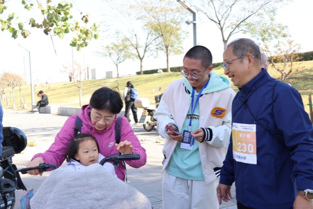 “爷爷!”终点前,一声稚嫩的声音吸引了大家的注意,浙江开放大学王武军老师抱起等待已久的孙女。他看着孙女笑着说,“我明年就要退休了,这场活动举办得非常好,很细节,很温馨。看到这么多志愿者在为我们服务,非常感动。”