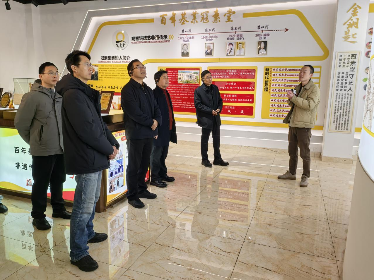 在博士创新站负责人缪文华博士及负责人的引导下,师生一行首先参观企业百年发展史,再隔窗参观了生产车间,实地观摩现代化生产流程,倾听缪博士的产学研成果报告,近距离感受舟山本土龙头企业的科技创新实力。随后,大家步入企业文化长廊进行参观,师生们穿梭于沈家门渔港、西横塘老街及冠素堂首店等还原场景中,在“舟山港百年变迁时光走廊”里深切领略了舟山特有的渔民文化、喜事文化及非遗魅力。 这一环节让学子们在了解海洋食品产业科技前景的同时,也深刻体会到了企业深厚的文化底蕴与人文情怀。