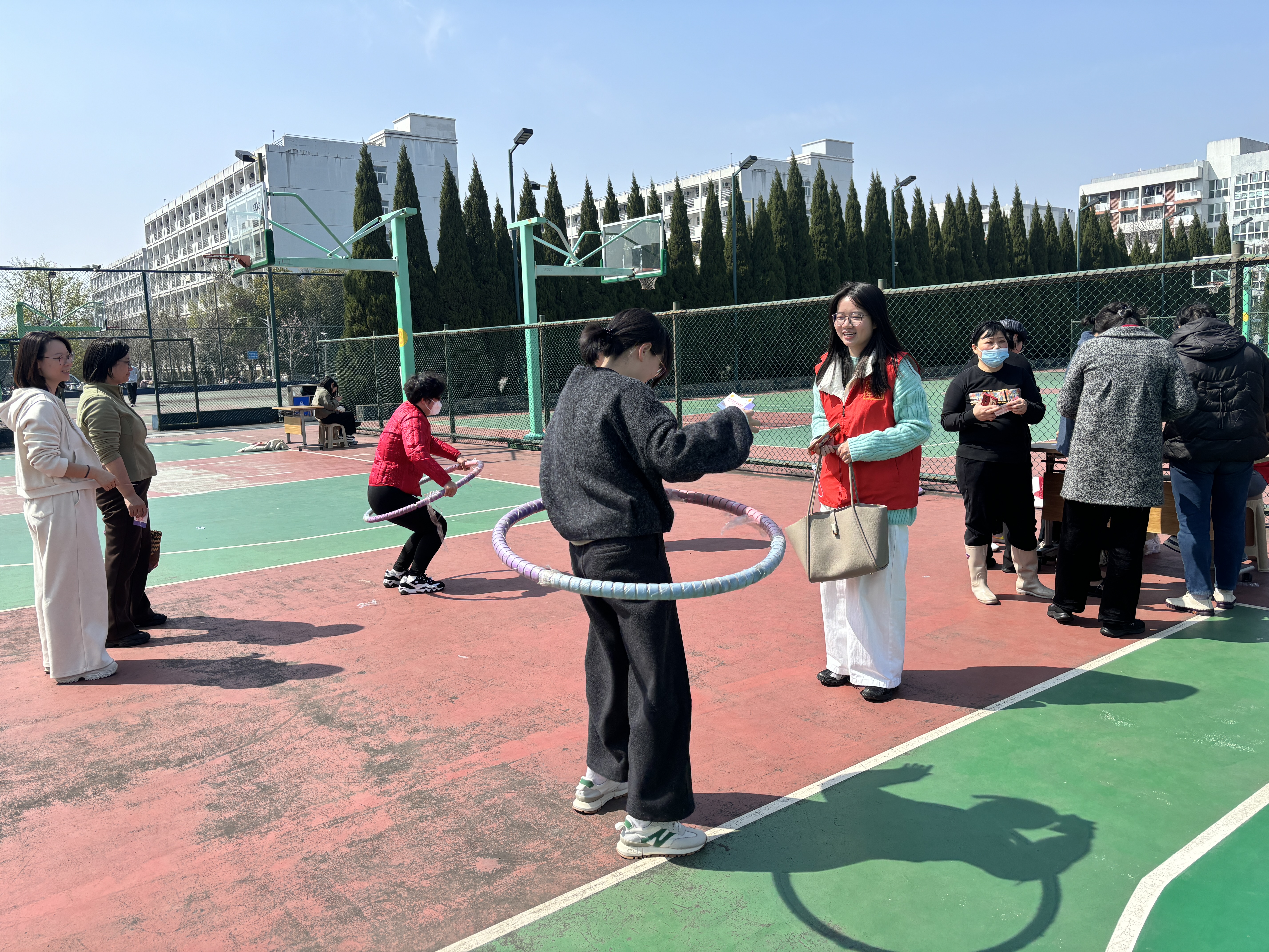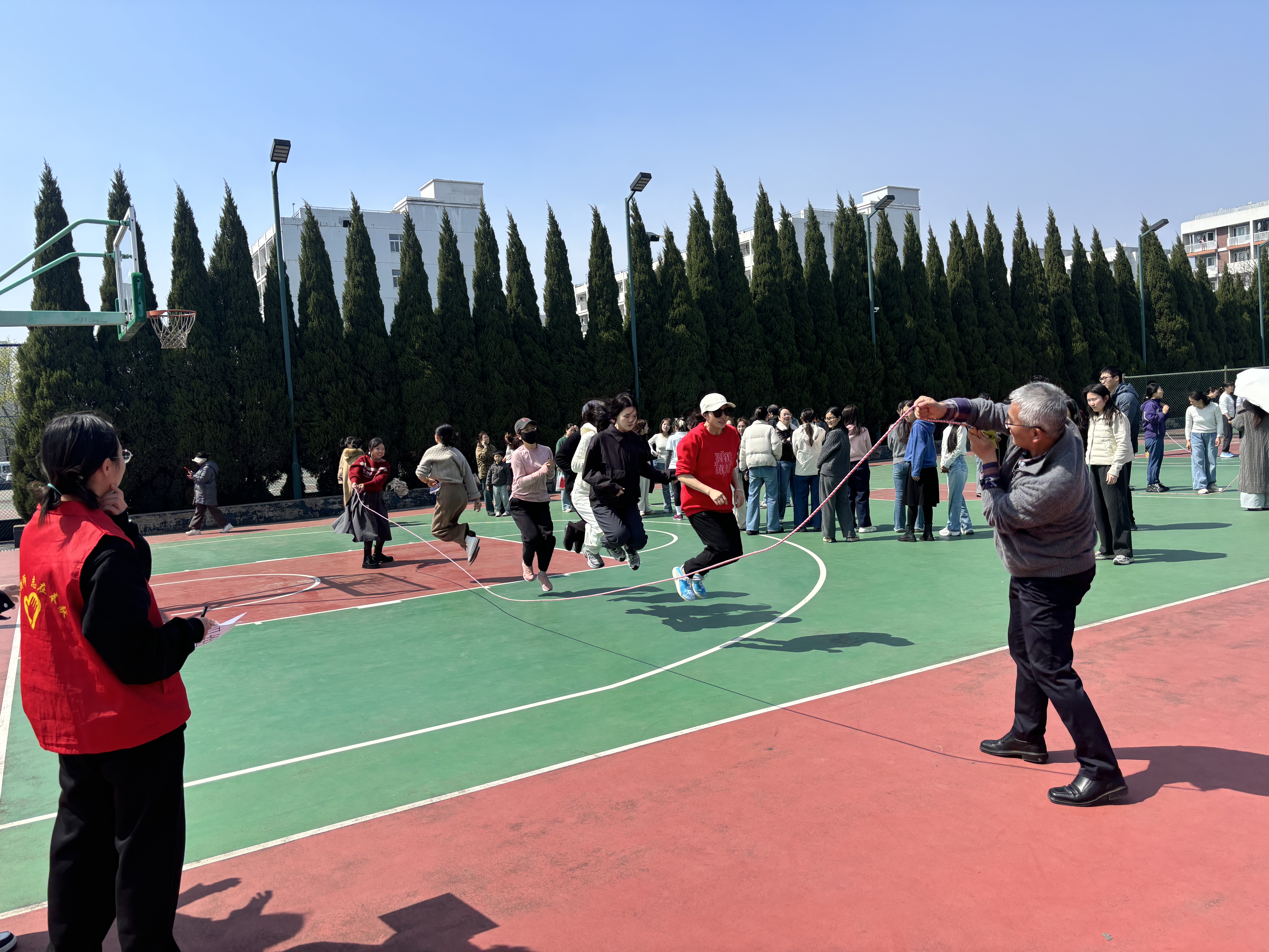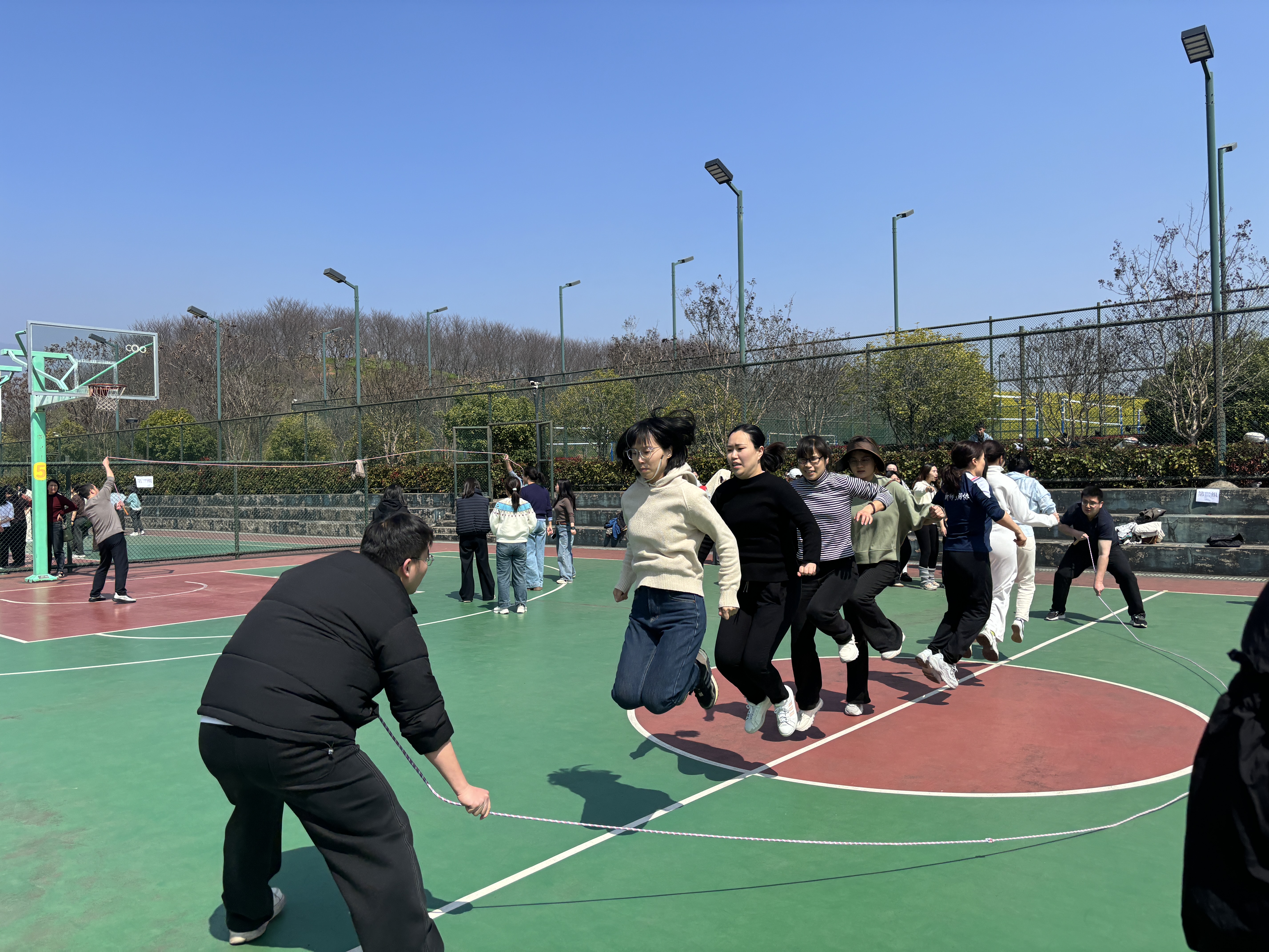 集体项目“齐心跳跃,共庆芳华”跳绳比赛中,女教职工们步伐整齐、节奏流畅,轻盈的身影与欢快的节奏相映成趣,大家齐心协力、默契配合,在跳跃中释放活力。