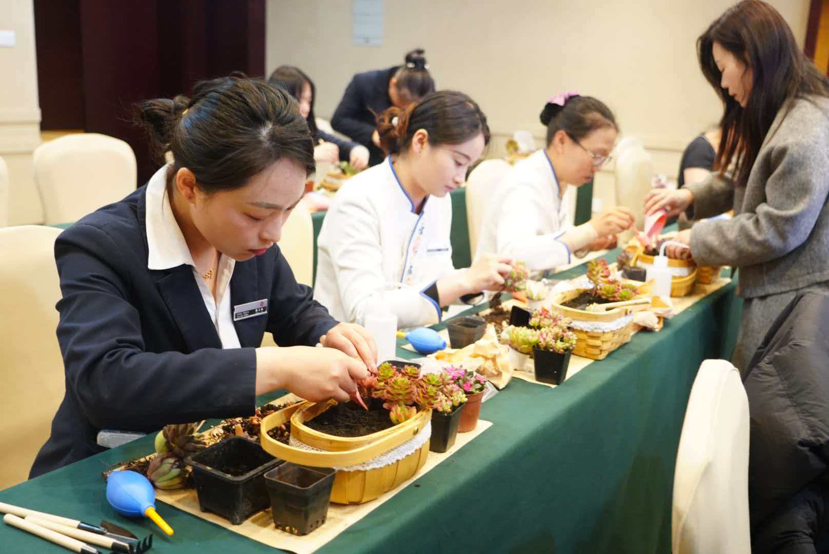 女职工们挑选形态各异的多肉植株,搭配精致藤编花篮,结合填土、定植、修剪的小技巧,将不同品种的多肉巧妙组合,错落摆放成别致的花艺作品。肥厚饱满的叶片、清新可爱的造型,再搭配些许装饰小物,让普通的花篮焕发生机。大家在与绿植的亲密接触中,亲手打造专属的春日美好,感受自然生机与创作的喜悦。
