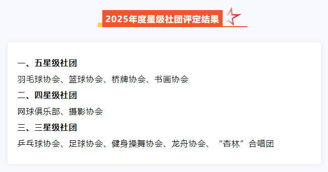 结合前期各社团纪实数据评估及本次工作汇报情况,会议最终确定了各社团星级评定结果。其中,羽毛球协会等4个社团荣获“五星级社团”称号,网球俱乐部等2个社团获得“四星级社团”称号,乒乓球协会等5个社团被评为“三星级社团”。