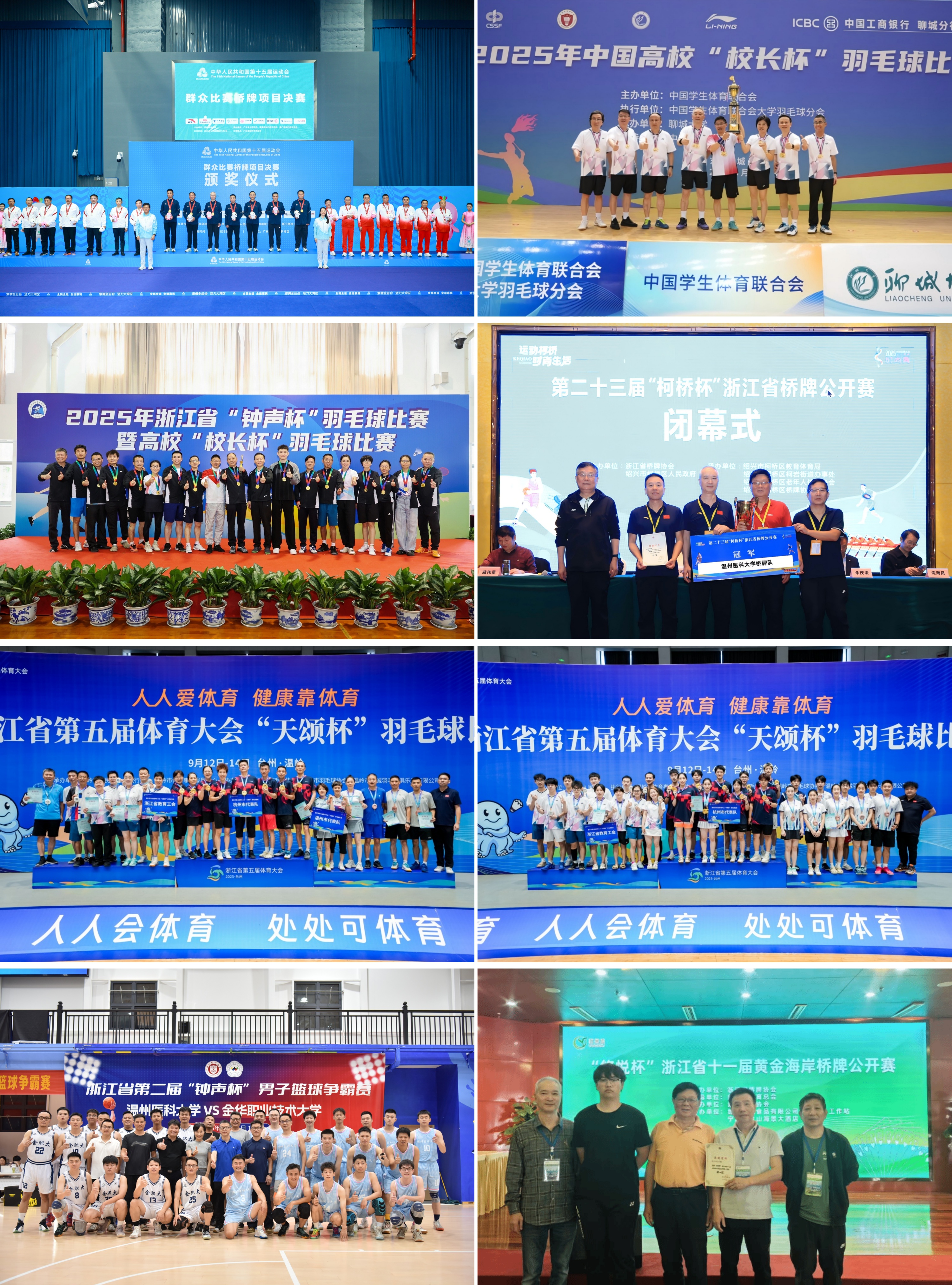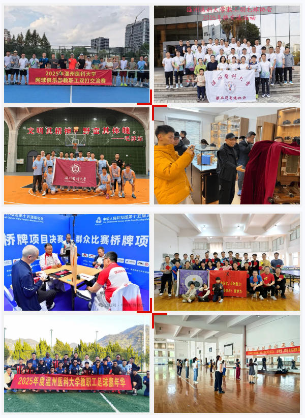 温医大教职工社团代表在各项赛事中奋勇争先、捷报频传,喜获第十五届全运会桥牌比赛金牌,中国高校“校长杯”羽毛球比赛混合团体赛冠军,省“钟声杯”羽毛球混合团体赛冠军,省“柯桥杯”桥牌公开赛冠军,省第五届体育大会羽毛球比赛混合团体中年组亚军、青年组亚军,省“钟声杯”男子篮球争霸赛B区亚军,省第11届“悠悦杯”黄金海岸桥牌公开赛第五名,首届“金烛奖”省教职工摄影大赛优秀奖等多项荣誉,用拼搏与实力为学校赢得了荣誉,也展现了温医大教职工积极向上、奋勇拼搏的精神风貌。