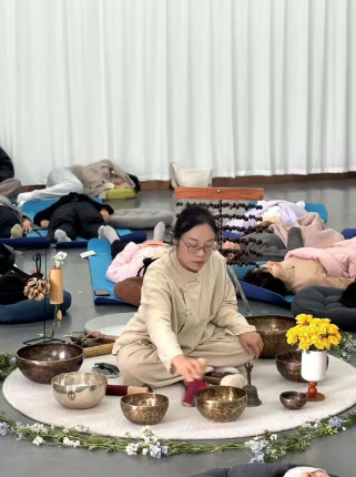 活动现场错落点缀着鲜花与绿意,音束、雨棍等自然乐器静置其间,蒸汽眼罩与柔软垫枕为身心提供贴心的承托。参与者于音波流淌中闭目安躺,每一寸疲惫都被温柔接纳,在花香与音声的环抱里,抵达属于自己的静谧之地。