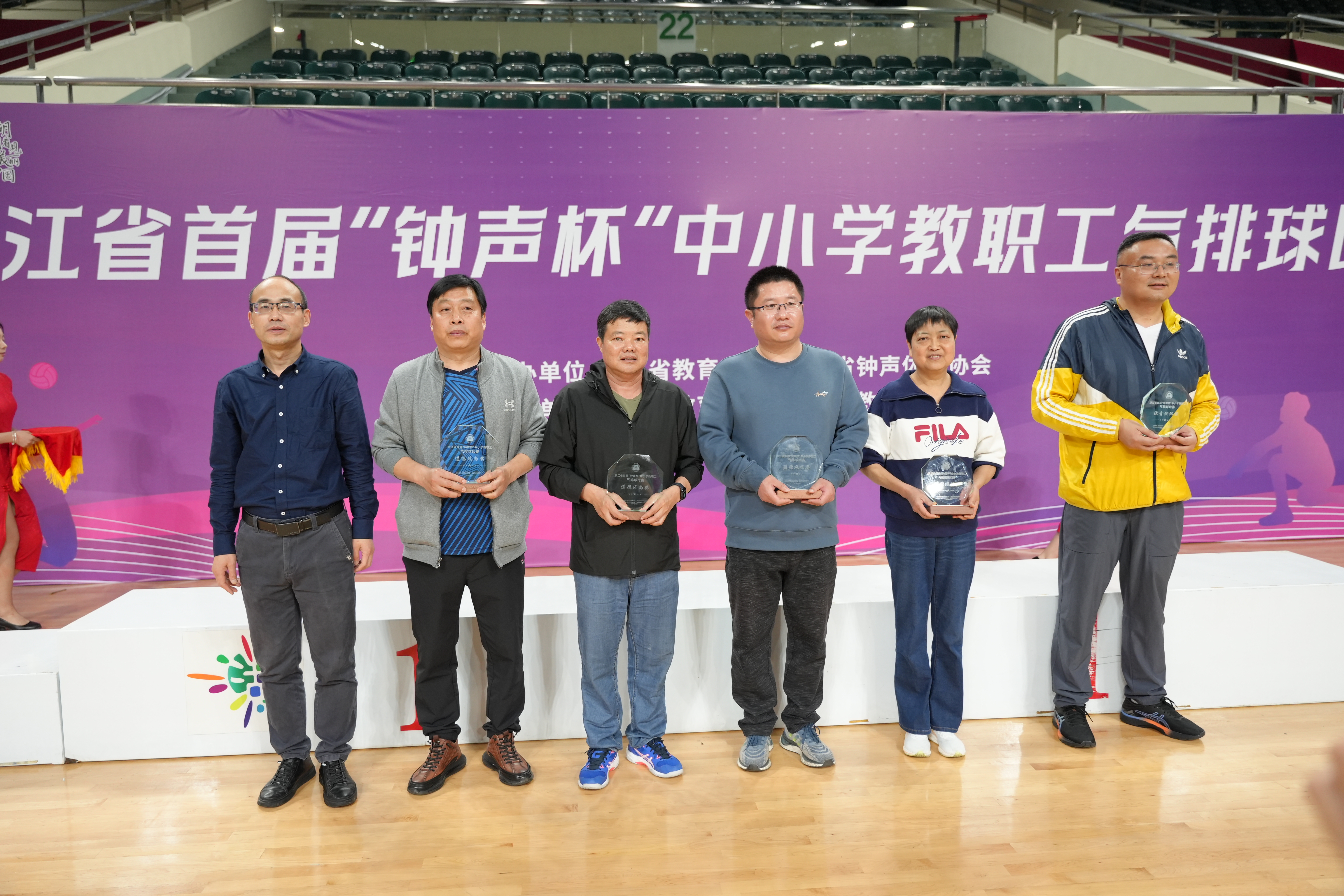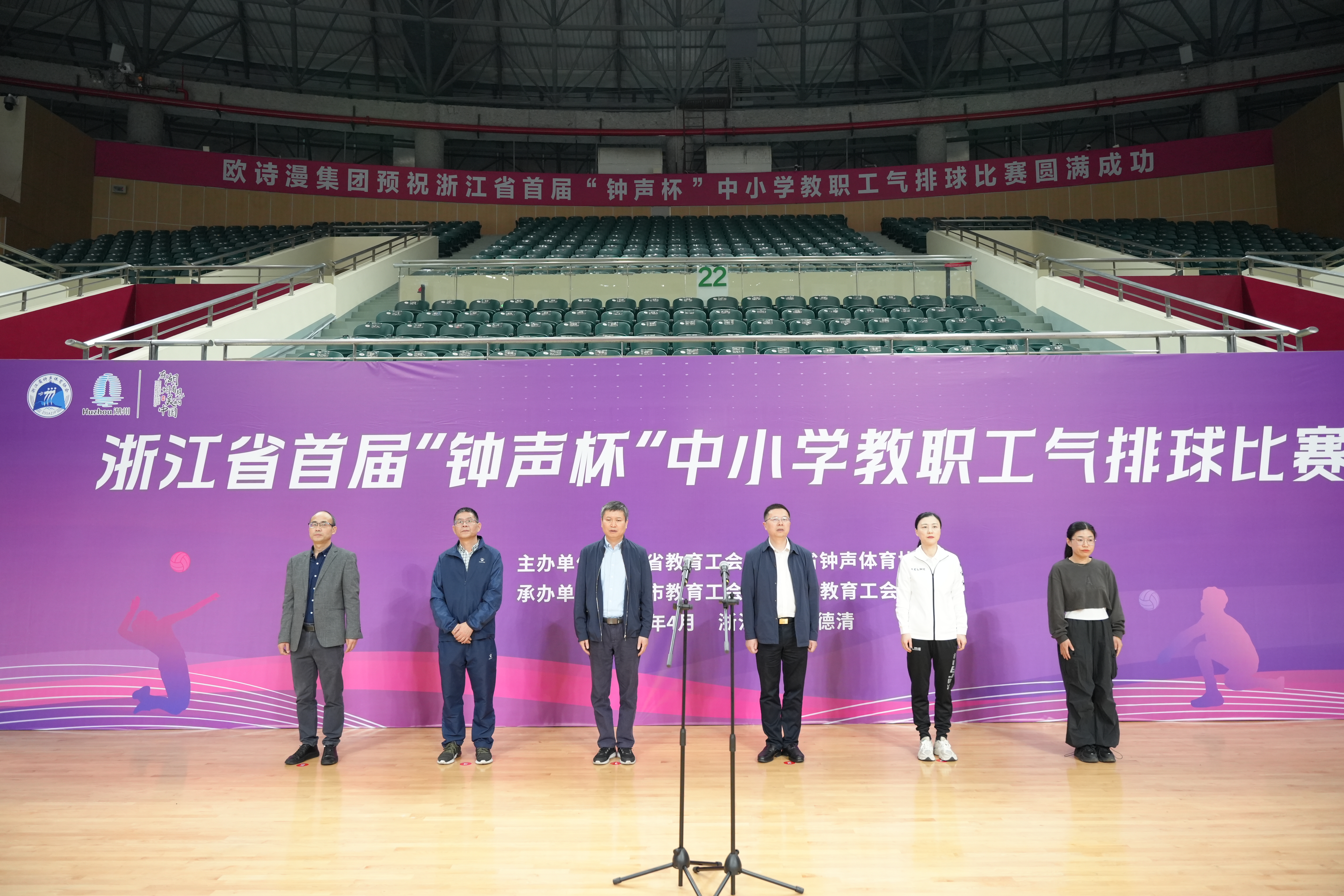 为大力弘扬体育精神,丰富我省中小学教职工文体生活,增进地区间交流与友谊,4月19日-21日,由浙江省教育工会、浙江省钟声体育协会主办,湖州市教育工会、德清县教育工会承办的浙江省首届“钟声杯”中小学教职工气排球赛在德清县体育中心举行。浙江省教育工会一级调研员葛海平,湖州市总工会副书记、副主席沈康康,湖州市委教育工委专职副书记胡卫东,湖州市教育工会主席黄桢,德清县教育局党委书记陶卫虎 ,德清县总工会党组书记常务副主席郭宁宁等领导以及约190名运动员、裁判员一起参加了开幕式,沈康康致开幕辞,葛海平宣布比赛开幕。