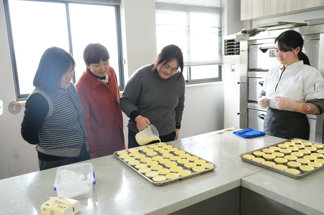 之后在育聪楼四楼实训室,女职工们迎来了一场别开生面的“沉浸式上课体验”——中西面点制作。专业教师现场示范,学生助手热情协助,大家认真学习揉面、塑形、烘烤等技巧,亲手制作出香气扑鼻的糕点、蛋挞。当一份份甜蜜的作品出炉,现场欢声笑语不断,大家纷纷合影留念,记录下这份亲手创造的成就感。