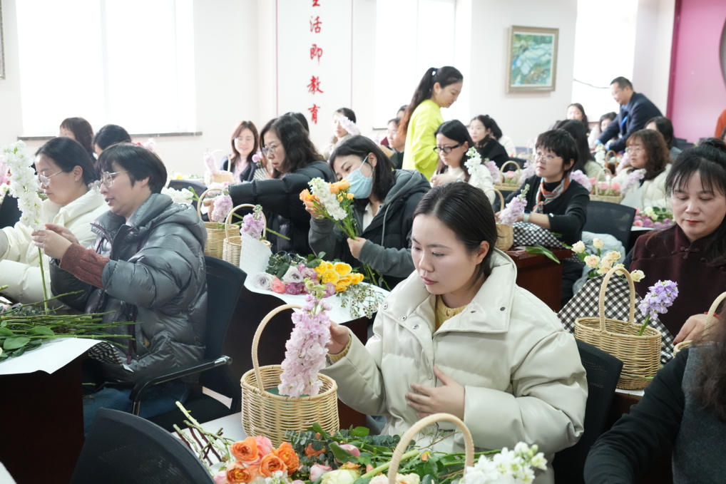 随后在花艺老师细致讲解插花技巧中,女职工们精心挑选花材,巧妙构思,将一朵朵鲜花精心组合成一个个别致的小花篮。大家还在卡片上写下对未来的美好祝愿,将春日的浪漫与希望一同封存。