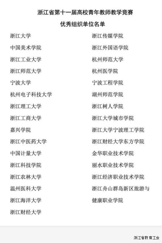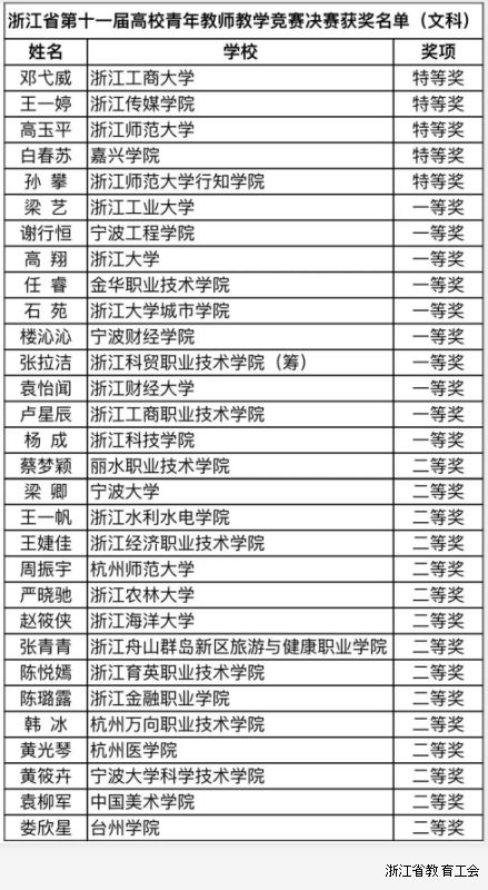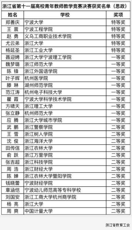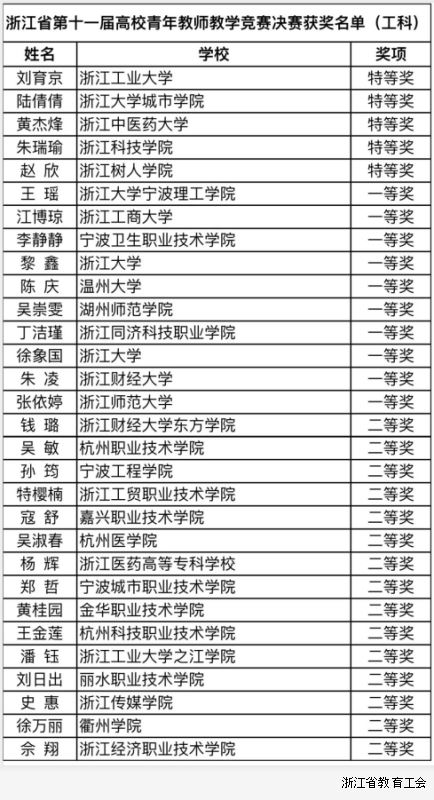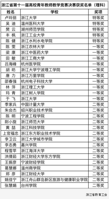 浙江省第十一届高校青年教师教学竞赛获奖名单