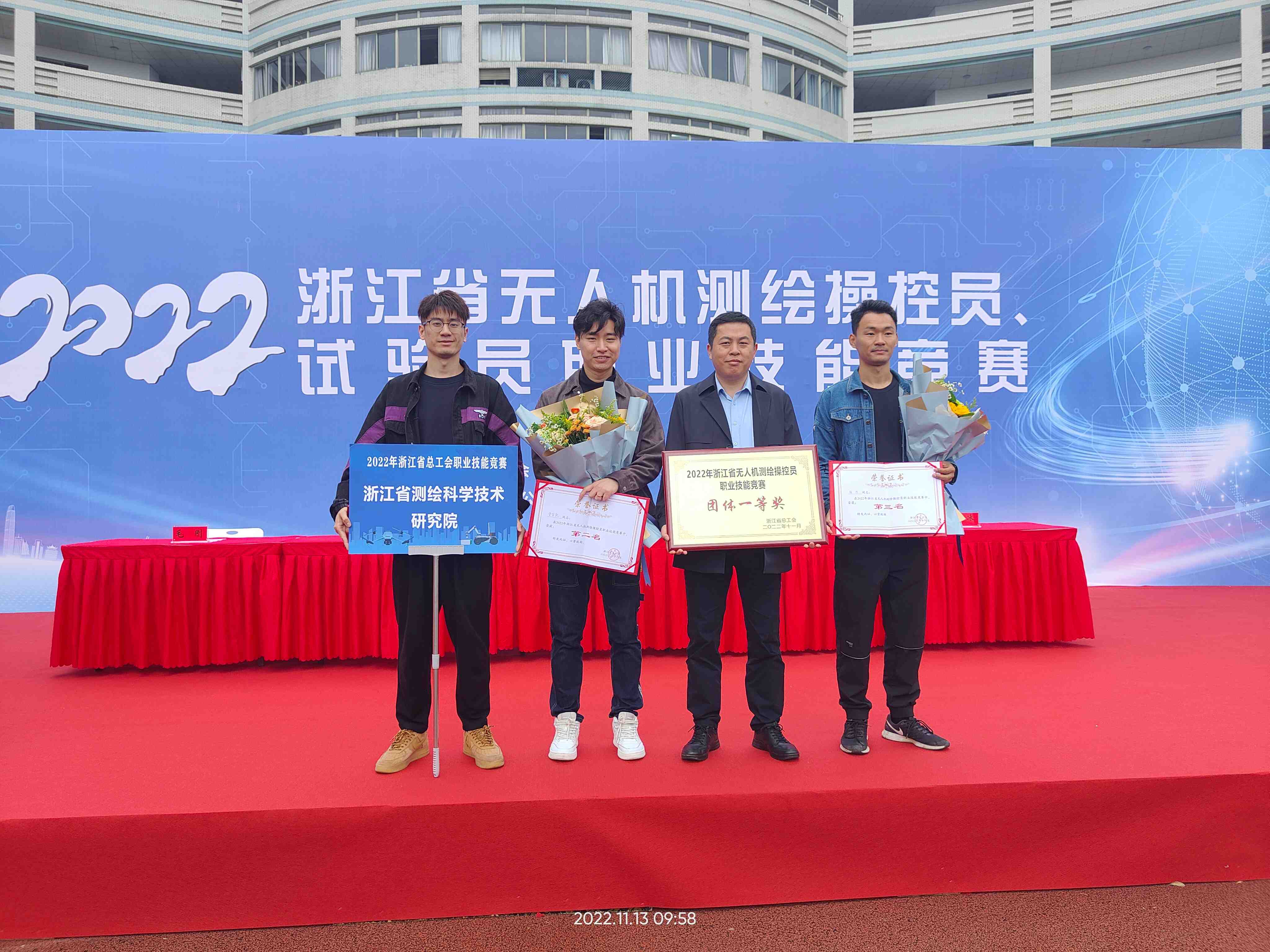 11月11日-12日,在浙江省总工会、浙江省交通运输厅联合举办的全省无人机测绘操控员比赛中,省测科院斩获了团体第一名的好成绩,参赛选手童宗凯、张帅分别获得个人第二名、第三名的好成绩,并将被授予“浙江金蓝领”称号。