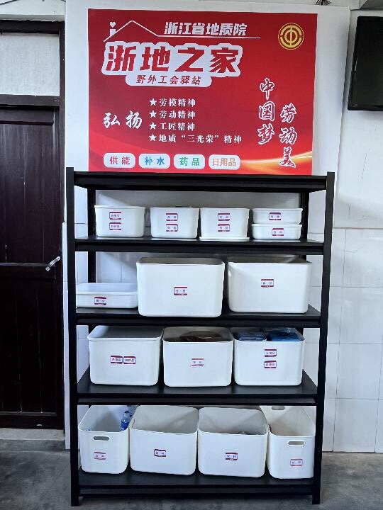 “浙地之家”工会品牌以“红心、创新、服务、筑梦、活力”五维建设为支柱,持续拓展“家”的广度与深度。此次野外工会驿站的设立,正是品牌向野外项目前沿的深情延伸。驿站虽简,关怀却厚,从雨伞、充电宝等日用品,到应急药品,再到解乏充能的方便食品、提神饮品,甚至细心地备上了针线盒——每一件物品都精准回应着野外队员最实际、最细微的需求,无声诉说着“后方”对“前线”战友的牵挂。