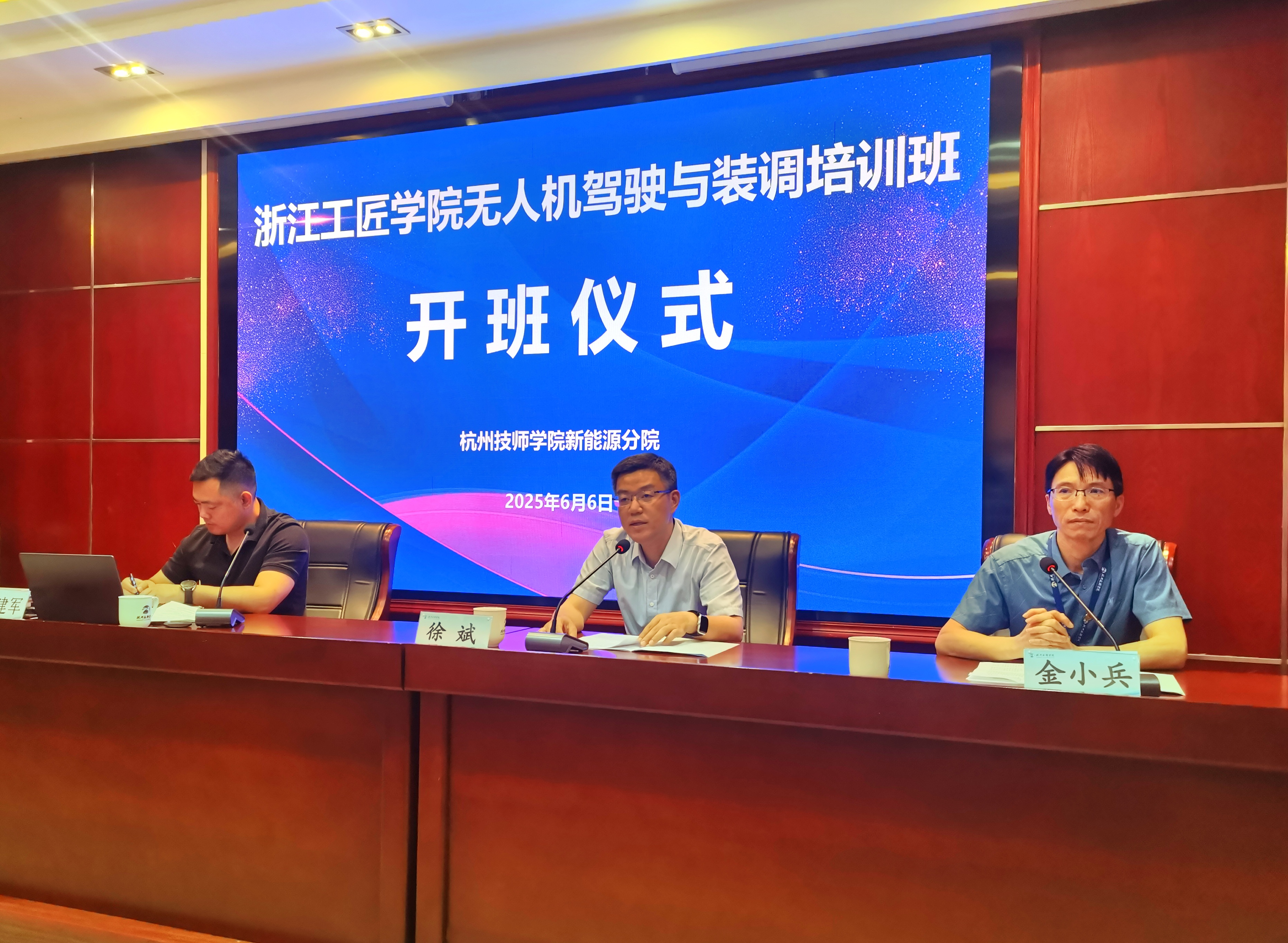 6月6日,浙江工匠学院新能源汽车分院(杭州技师学院)无人机驾驶与装调培训班在桐庐开班。浙江省总工会干部学校(浙江工匠学院)党委委员、副校长徐斌讲话,杭州技师学院副校长金小兵致辞,开班式由杭州技师学院继教学院院长杨建军主持,来自全省36名企业职工参加培训。