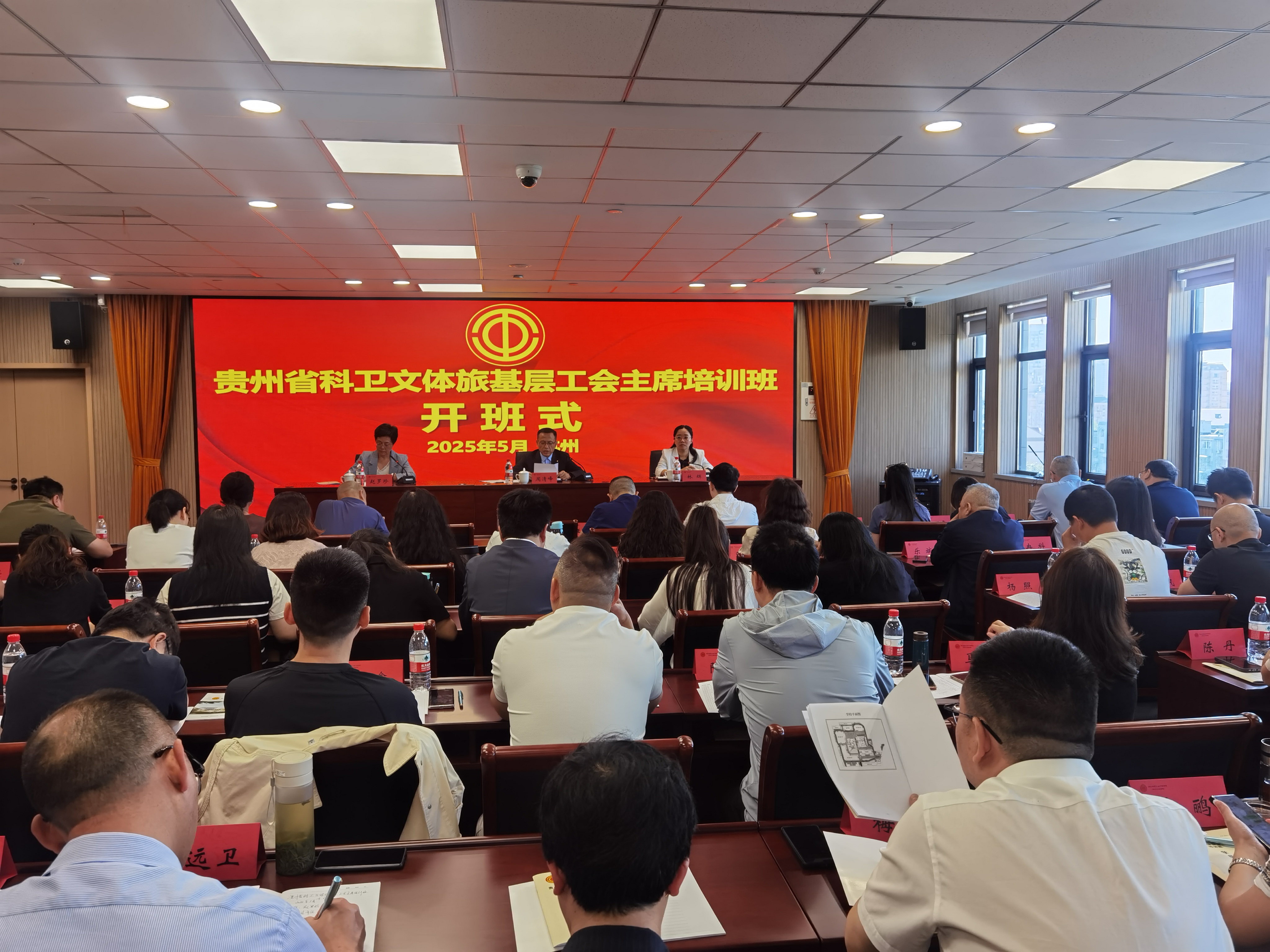 5月12日上午,贵州省科卫文体旅基层工会主席培训班顺利开班,浙江省总工会干部学校党委书记、校长林辉致辞,贵州省科卫文体旅工会主席周清峰动员讲话,开班式由贵州省总工会干部学校党委副书记、纪委书记赵罗珍主持,培训班66人参加开班式。
