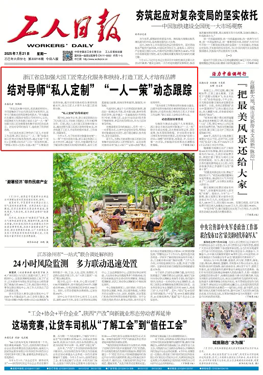 日前,《工人日报》、全国总工会微信公众号刊发报道介绍浙江省总工会以“一人一策”加强大国工匠常态化服务和扶持,打造工匠人才培育品牌工作经验。