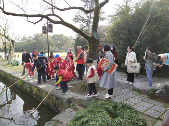 在花港观鱼公园,工人疗养院第一支部的党员携手杭州九莲小学的小朋友共同开展“大手拉小手,共护西湖迎亚运”志愿活动,同学们在党员志愿者的带领下,拿起重重的网兜,打捞西湖中漂浮在水面上的水草和有色垃圾,为保护西湖水质贡献自己一份小小的力量。同时党员志愿者在湖边与孩子们围在一起,讲解关于西湖生态水环境的知识,让孩子们从小就了解保护西湖的重要性,同时也实现孩子们当一会“西湖美容师”的微心愿。