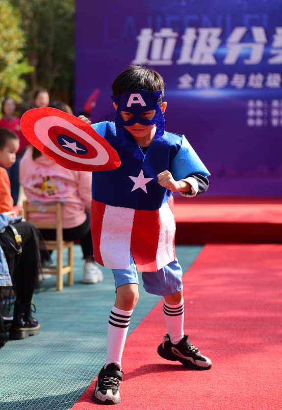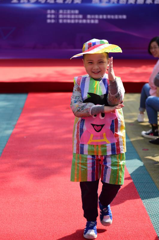“接下来,登台的是一条动人的美人鱼,她拖着长长的尾巴,就像刚从海里游上岸......”随着官河锦庭幼儿园的老师念着串词,小朋友们穿着爸爸妈妈用塑料袋、废纸箱、废卡纸等废旧物品制作而成的“时装”,在红毯上走出了自己的个性和风采。