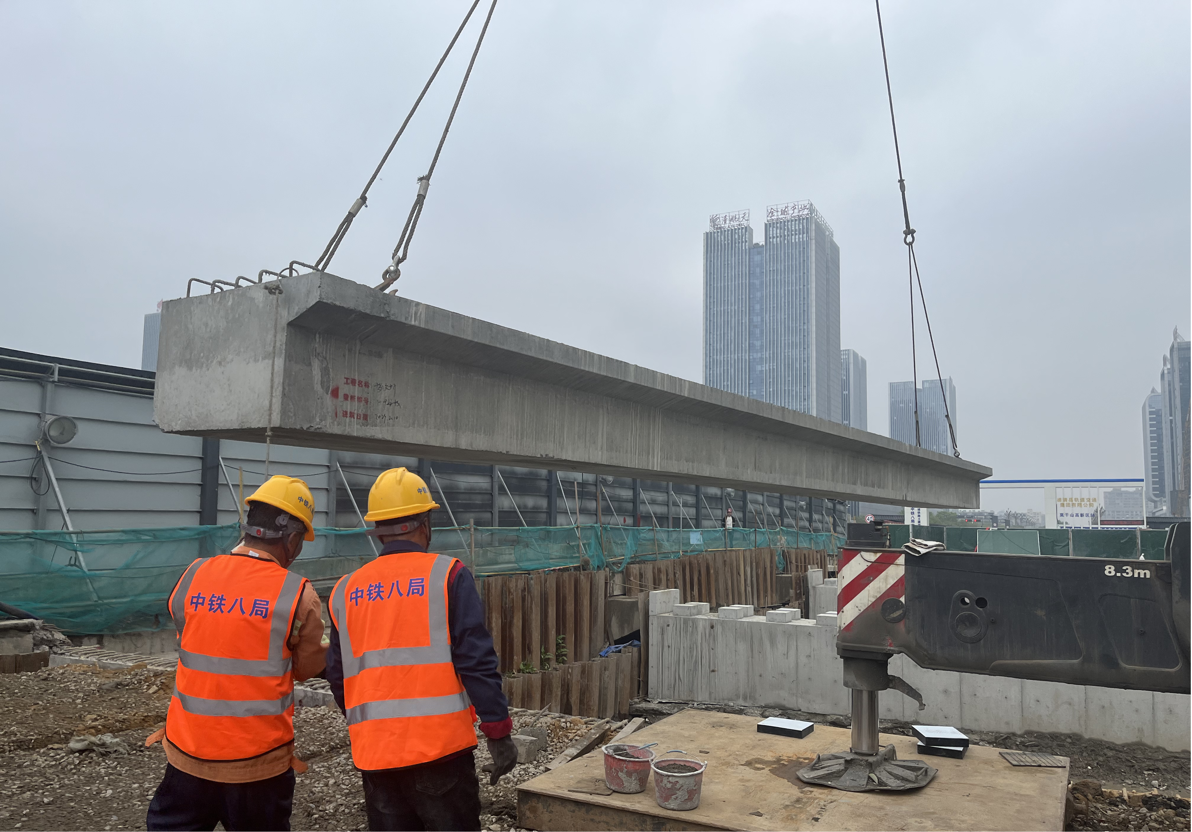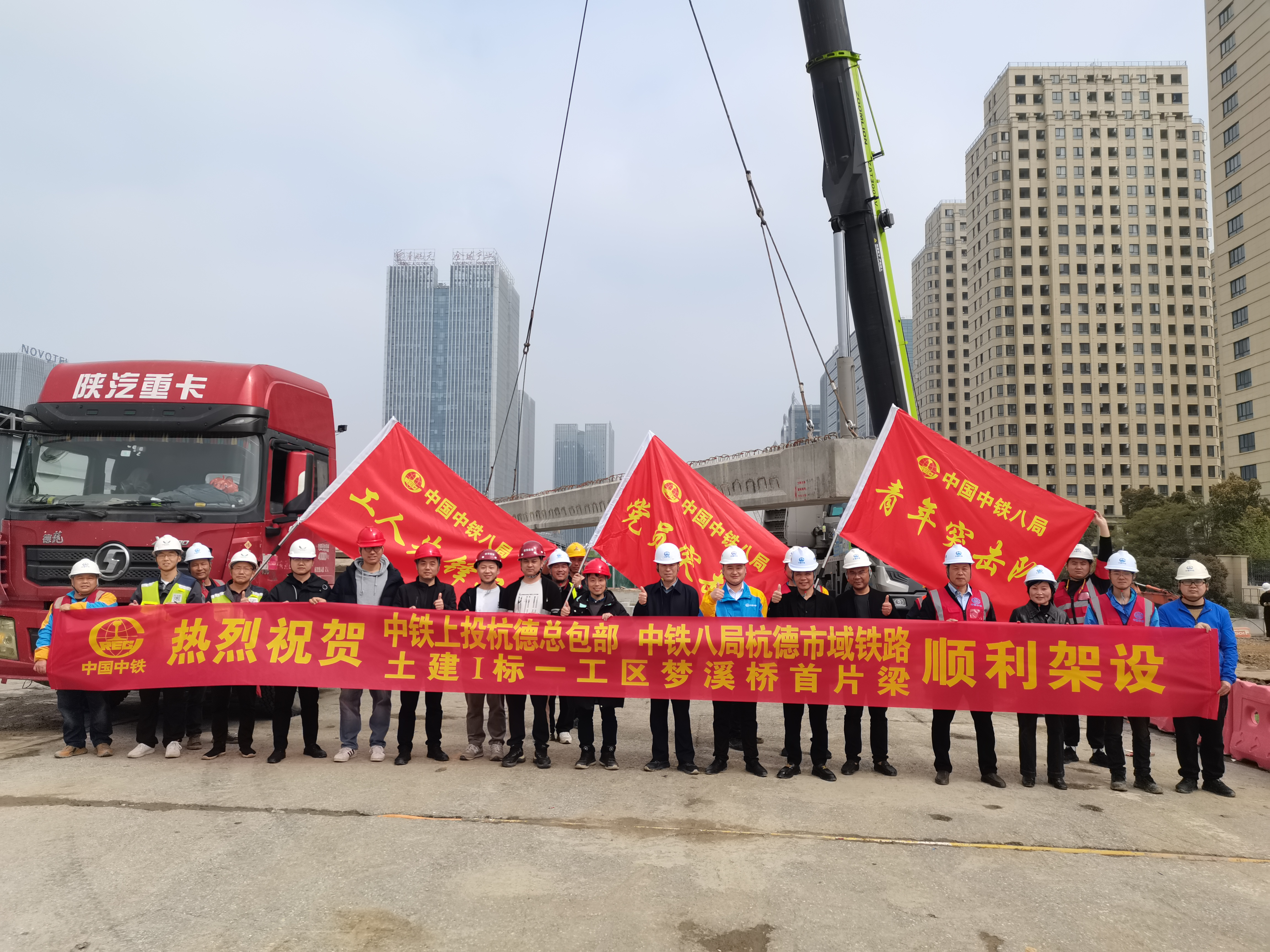 为确保梦溪桥顺利架梁,中铁上投杭德市域铁路总包部、中铁八局杭德项目部超前谋划、精心编制桥梁架设专项施工方案并组织专家论证,确保桥梁施工过程安全可控;技术骨干积极对外协调,实现河道安全导流;现场管理和作业人员24小时连轴转。为保证梁片预制质量,提前半年预制生产,定期督导协调,高效实现杭德市域铁路桥拆复建工程有序推进。