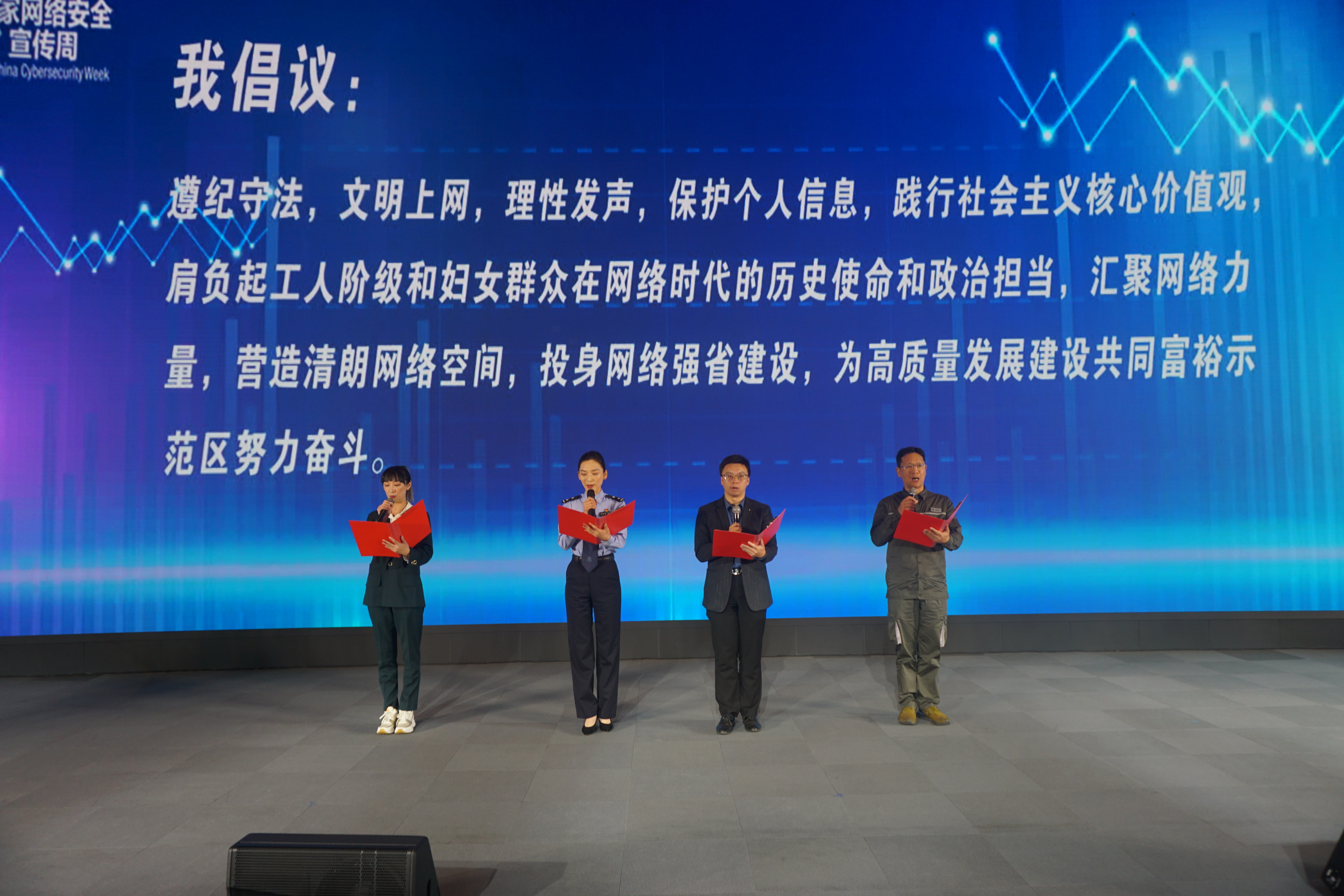 “我倡议,遵纪守法,文明上网,理性发声,保护个人信息。”活动现场,“浙江工匠”、浙江海瑞网络科技有限公司研发总监陈晗,省劳模、国网浙江省电力公司湖州供电公司安监组组长杨小东等人上台宣读《网络安全倡议书》,倡议全省广大职工和妇女群众,践行社会主义核心价值观,肩负起工人阶级和妇女群众在网络时代的历史使命和政治担当,汇聚网络力量,营造清朗网络空间,投身网络强省建设,为高质量发展建设共同富裕示范区努力奋斗。
