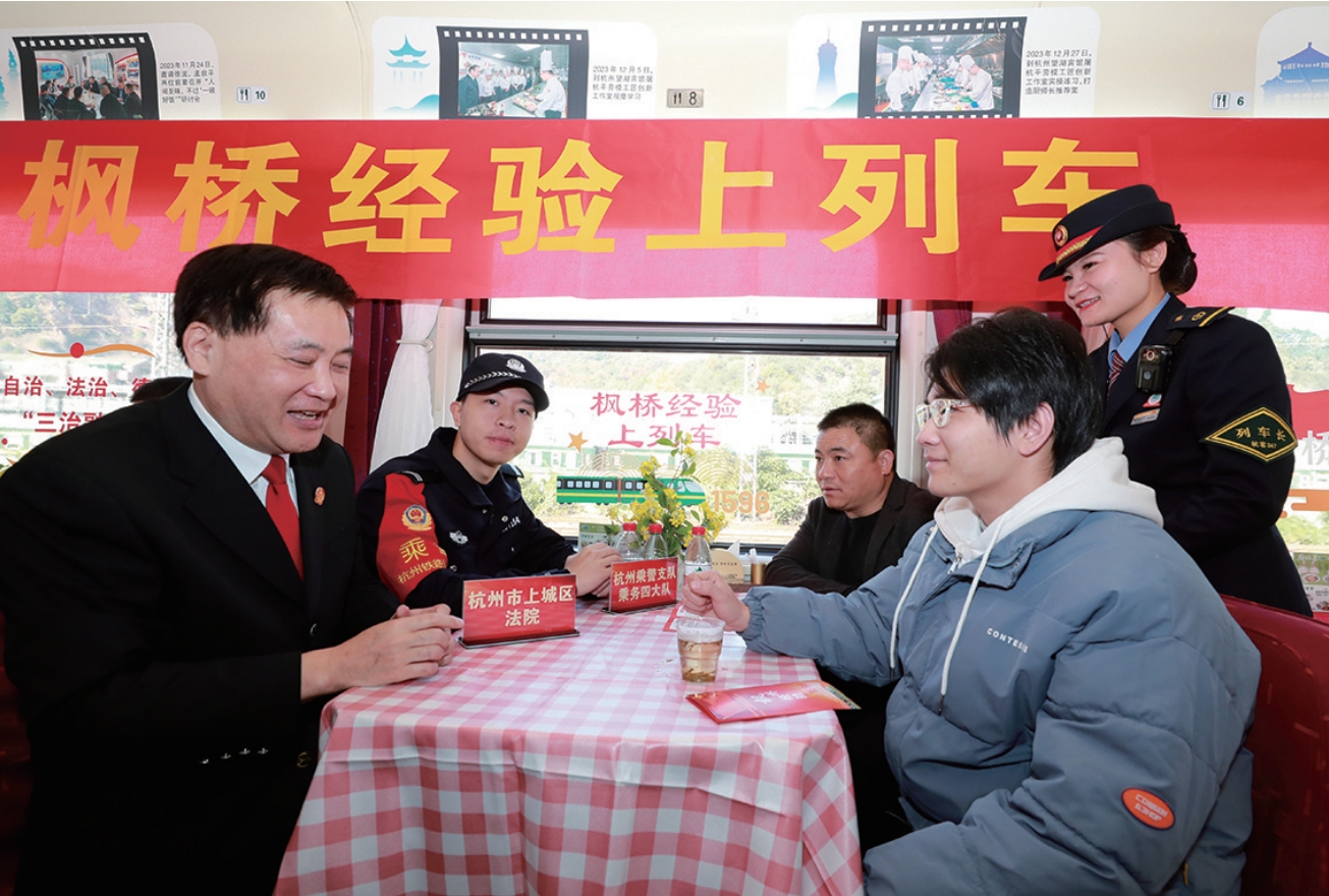 让先进经验在车厢发光,请热心乘客为旅途守护。昨日上午,浙江省总工会组织牵头铁路杭州客运段甬广车队、杭州乘警支队乘务四大队、诸暨市总工会、绍兴枫桥学院“枫桥经验”教研室、杭州市上城区朱学军法官调解工作室、温州市瓯越调解中心共同开展“枫桥经验”上列车宣讲活动,发挥联动效应,打造平安列车。