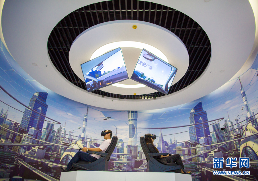 市民在内蒙古呼和浩特玉泉区大数据应用产业基地体验VR眼镜(2017年8月1日摄)。新华社发(丁根厚 摄)