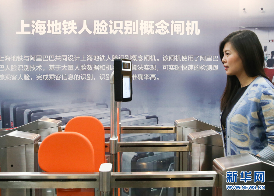 在上海申通地铁集团有限公司,工作人员在现场体验刷脸进站技术(2017年12月5日摄)。新华社记者 丁汀 摄
