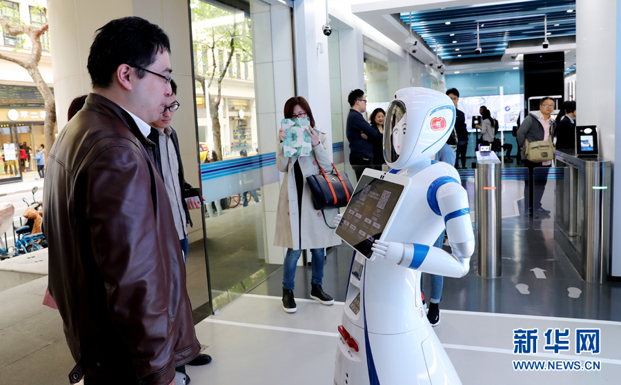 一位市民在位于上海九江路的无人银行入口处向迎宾机器人说明需要办理的业务种类(4月12日摄)。近日,中国建设银行在上海九江路开出国内首家无人银行。新华社记者 方喆 摄