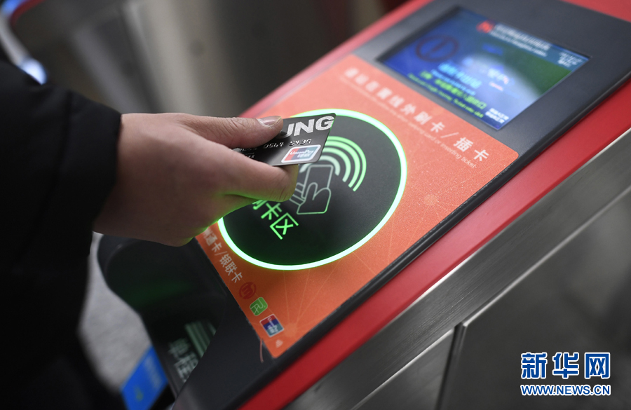 乘客在杭州地铁丰潭路站体验使用带有闪付功能的银联IC卡过闸乘车(2017年12月27日摄)。新华社记者 黄宗治 摄