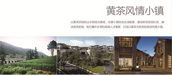 以黄茶茶园和山水田园为基础,完善小镇综合生活配套,建设新型田园社区,解决居民安置、吸引寓外乡贤和高端人才集聚,打造以黄茶为特色的旅游风情小镇。