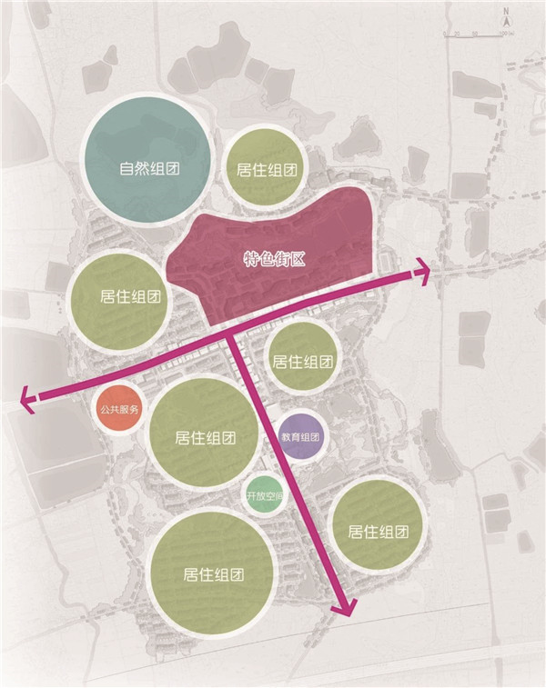 双轴——塔游线、杨士线沿线:保留原有建筑,进行综合整治,打造特色商业街。 多点——各功能组团:包括居住组团、教育组团、公共服务、自然生态等。