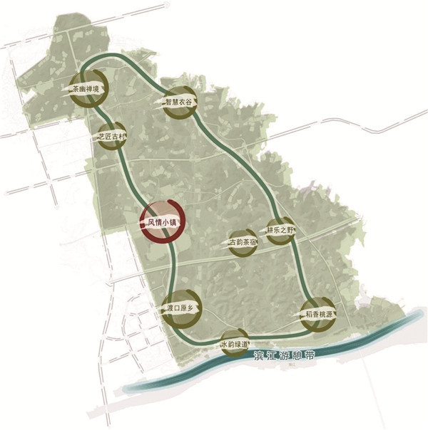 一心——小镇中心:黄茶小镇商业、文化、休闲中心,居民活动主要场所。
